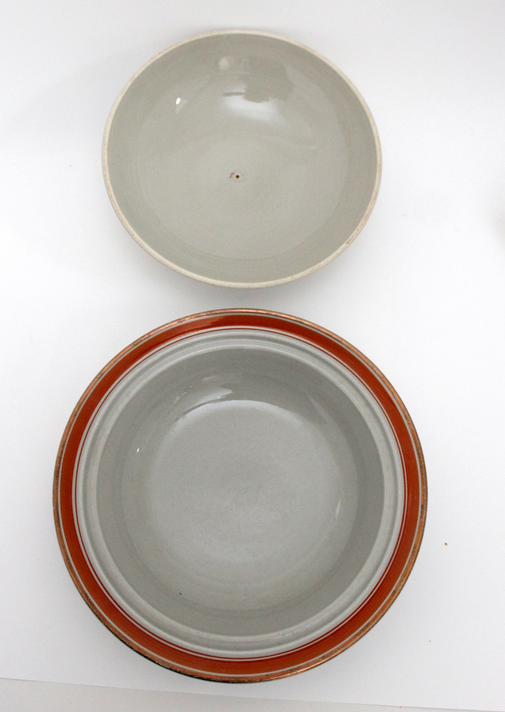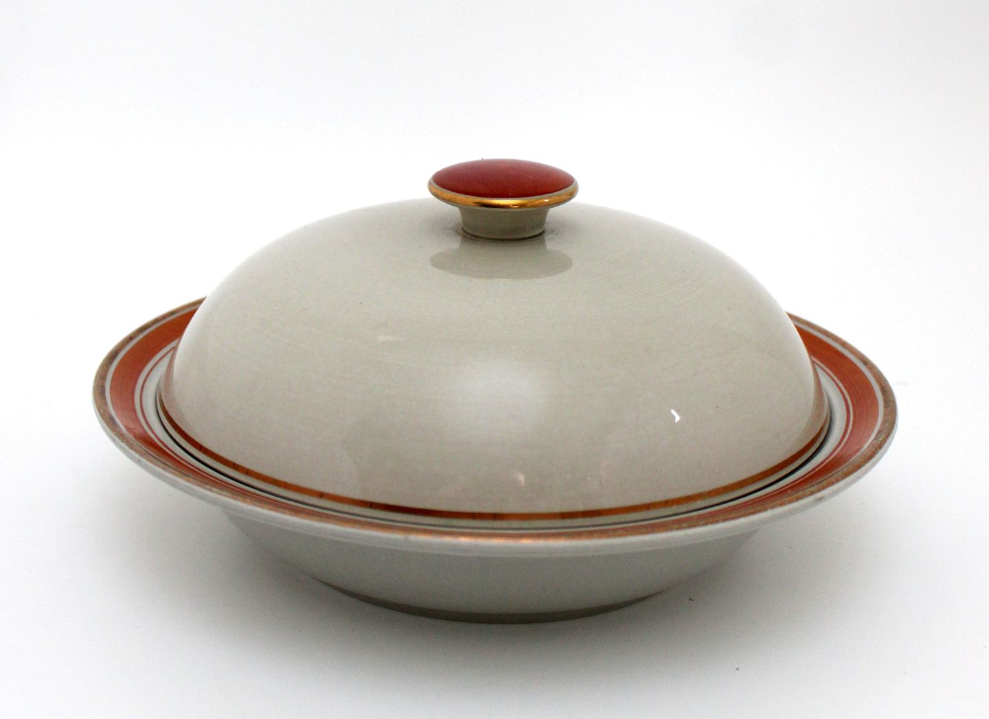 Aluminia, Tureby, grå fajance med orange fane samt guldkant. Designet af Nils Thorsson 1934-1968. Lågskål eller kompotskål, sjælden. Diameter 21 cm. Højde uden låg 4 cm. Med låg 11 cm. Fin stand. Pris: 350 kr. stk. Lager: 1 Udstiller