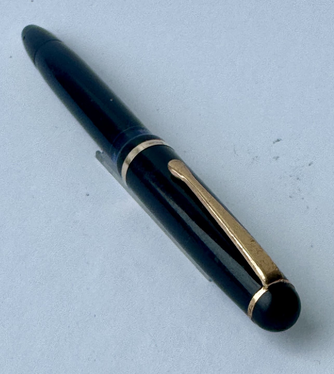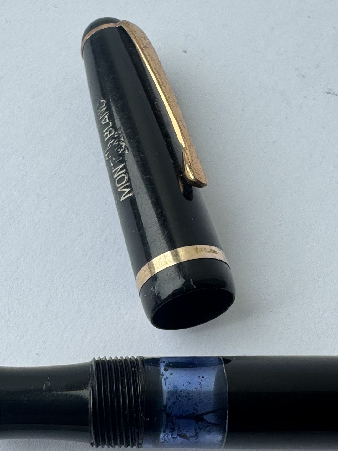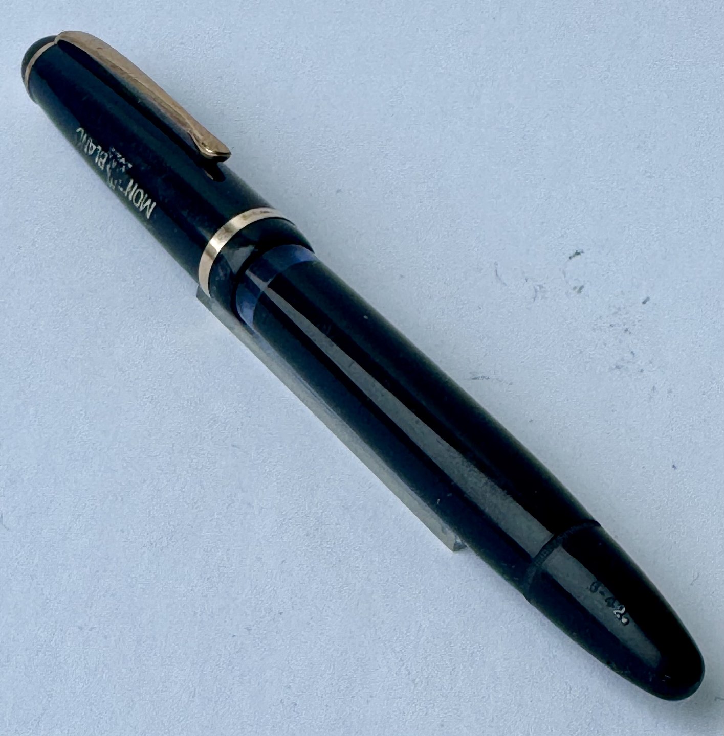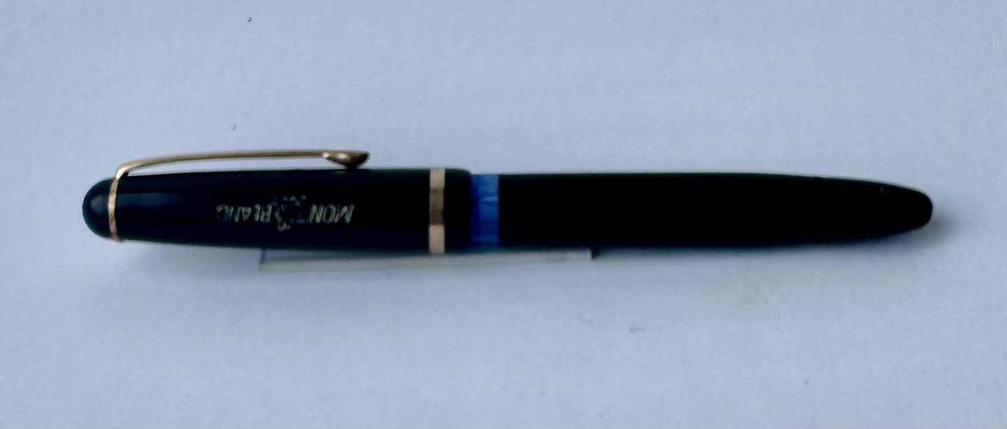 Sort Montblanc 3-42 fyldepen fra 1950’erne. Piston blæk-påfylder. Denne mekanisme fungerer fint, hvorfor pennen er klar til at blive brugt. Alle dele originale til denne model. Inklusiv en nr. 2 Montblanc stålspids. Ingen skader eller reparationer. Længde 12,7 cmv/ Jesper Reutemann