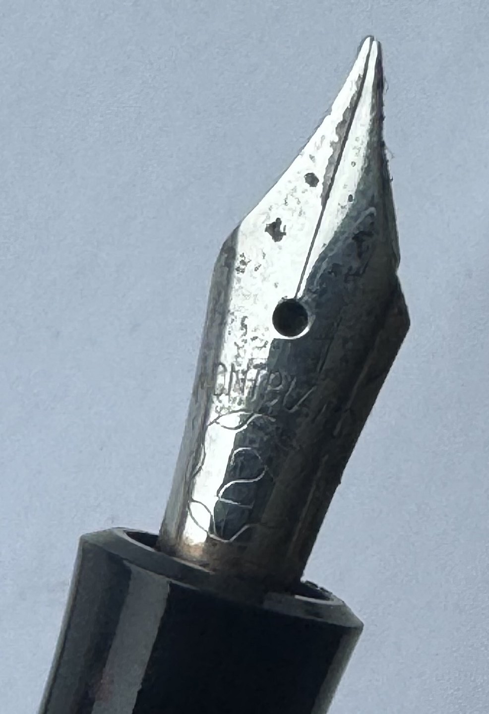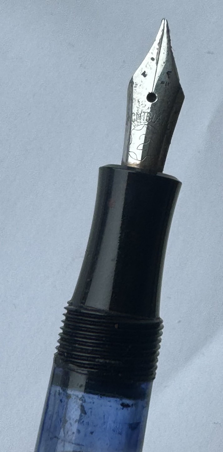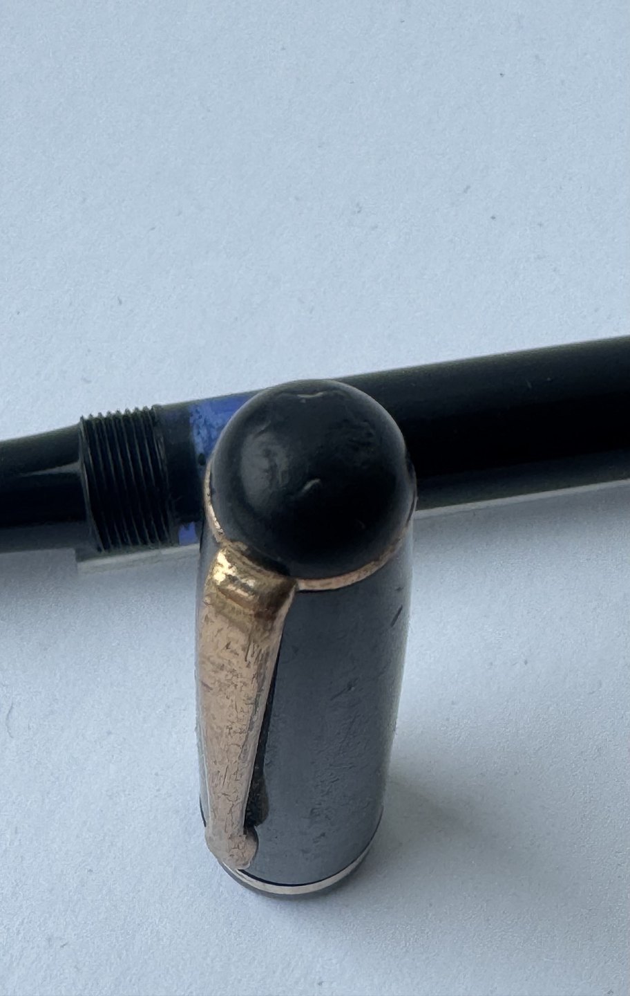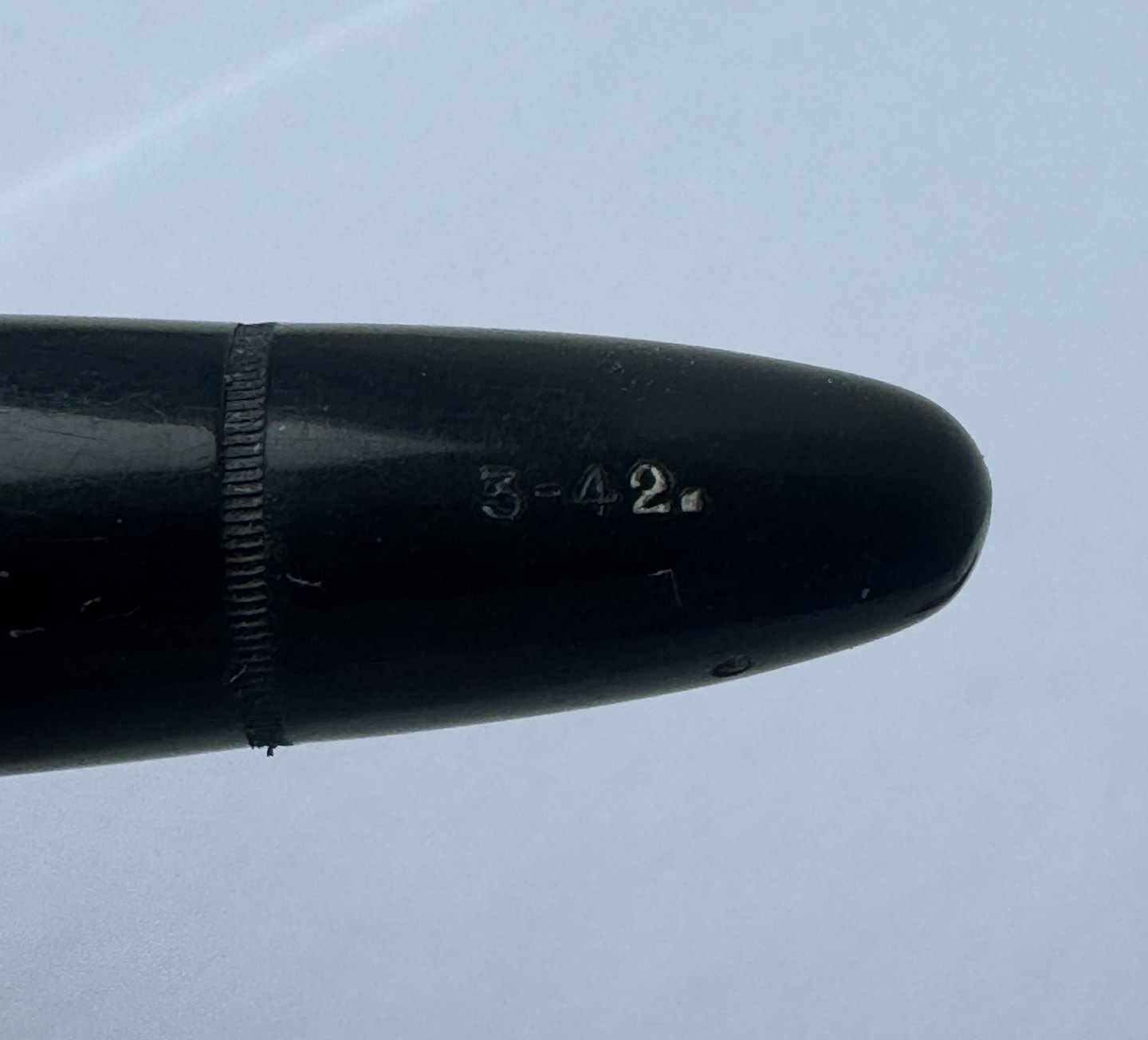 Sort Montblanc 3-42 fyldepen fra 1950’erne. Piston blæk-påfylder. Denne mekanisme fungerer fint, hvorfor pennen er klar til at blive brugt. Alle dele originale til denne model. Inklusiv en nr. 2 Montblanc stålspids. Ingen skader eller reparationer. Længde 12,7 cmv/ Jesper Reutemann