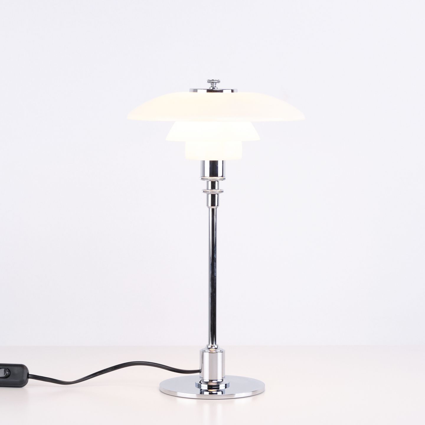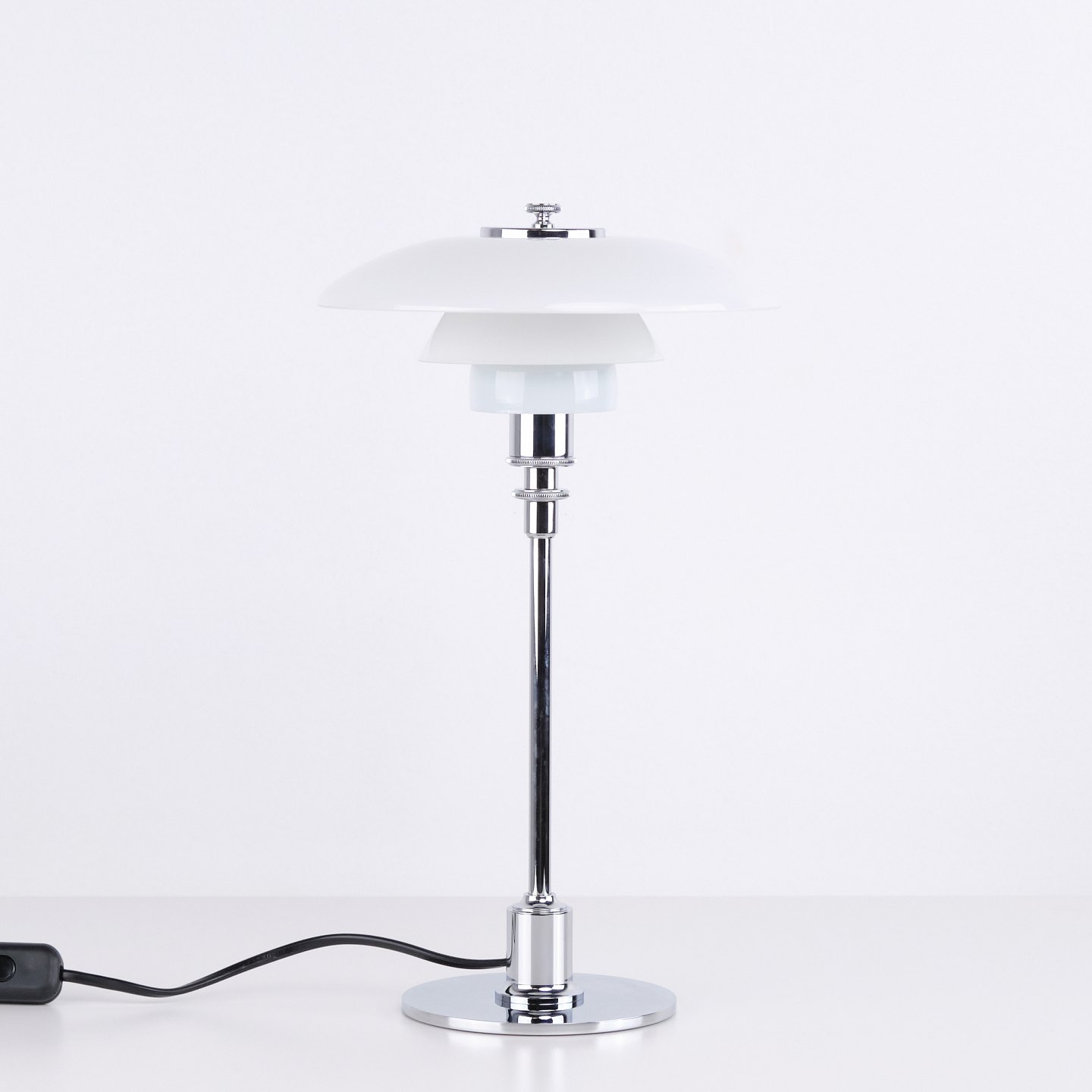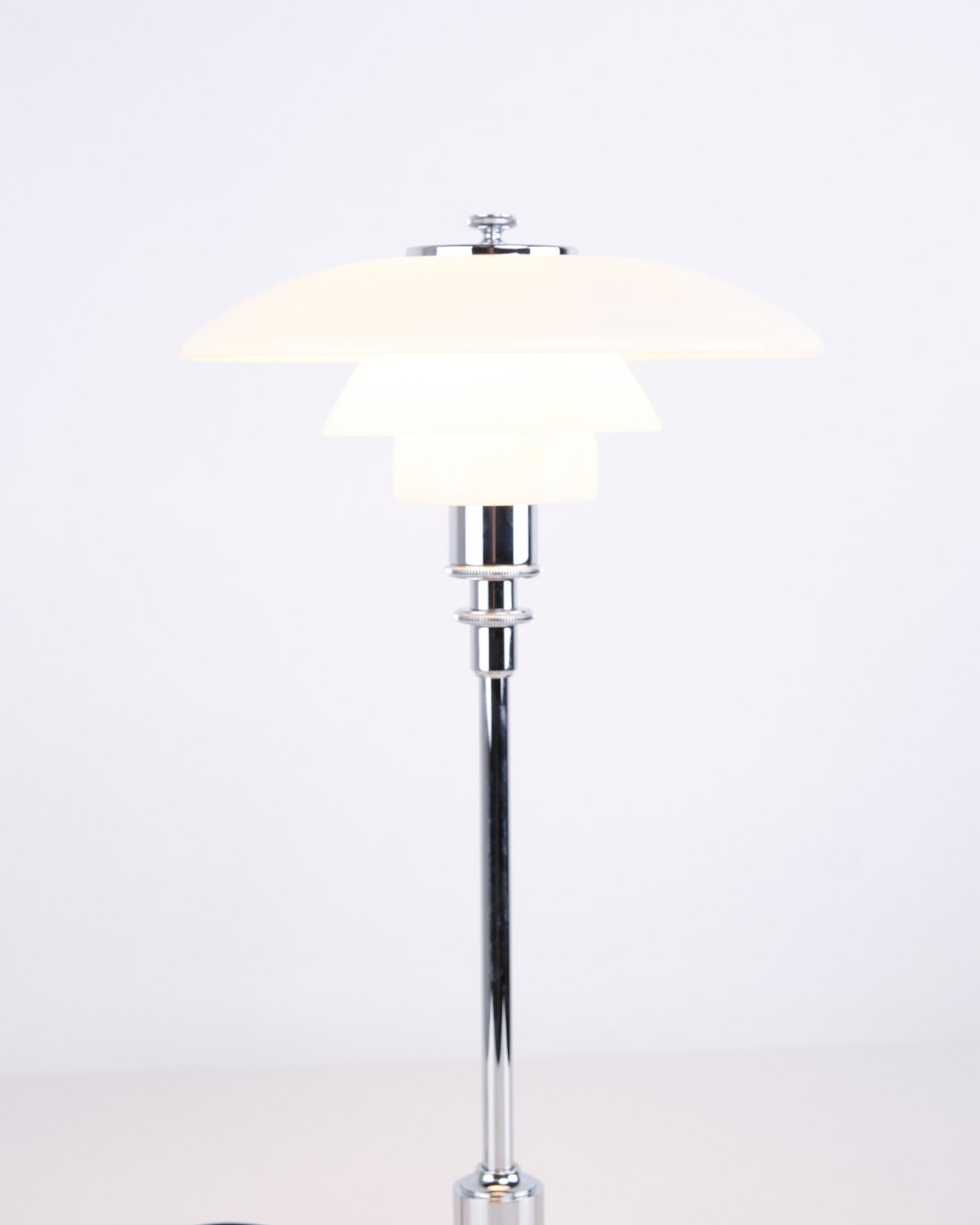 Klassisk PH 2/1 bordlampe designet af Poul Henningsen og fremstillet af Louis Poulsen. Lampen er udført i krom med skærme i hvidt opalglas, hvilket giver et let og elegant udtryk. Modellen består af en overskærm på ca. 20 cm kombineret med mellem- og underskærme fra PH 1/1, hvilket giver en særlig proportionering i designet.— Oprindelse: Danmark