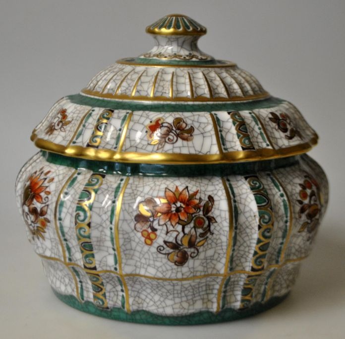 Dahl Jensen lågkrukke i craquelle, 241/704, 20. årh. København, Danmark. Håndmalede blomstermotiver, grønt og forgyldninger. H: 16 cm. Dia: 19 cm.Emne nummer: 29029