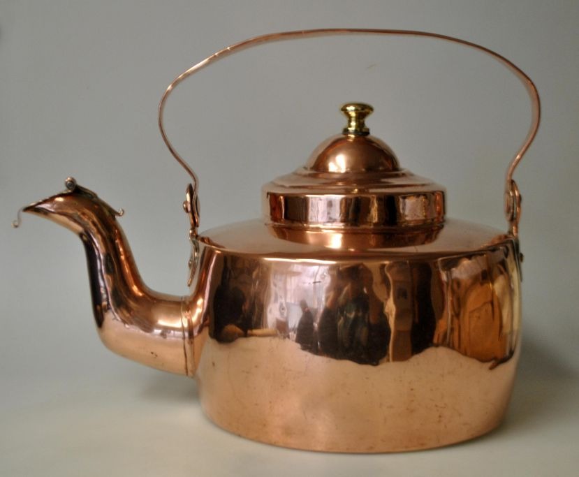 Kobber kedel, J. Hjernøe (1832-1871), Aarhus, Danmark. Stemplet. Med hank og tud. Låg med messing knop. Højde med hank: 22 cm.Emne nummer: 29031