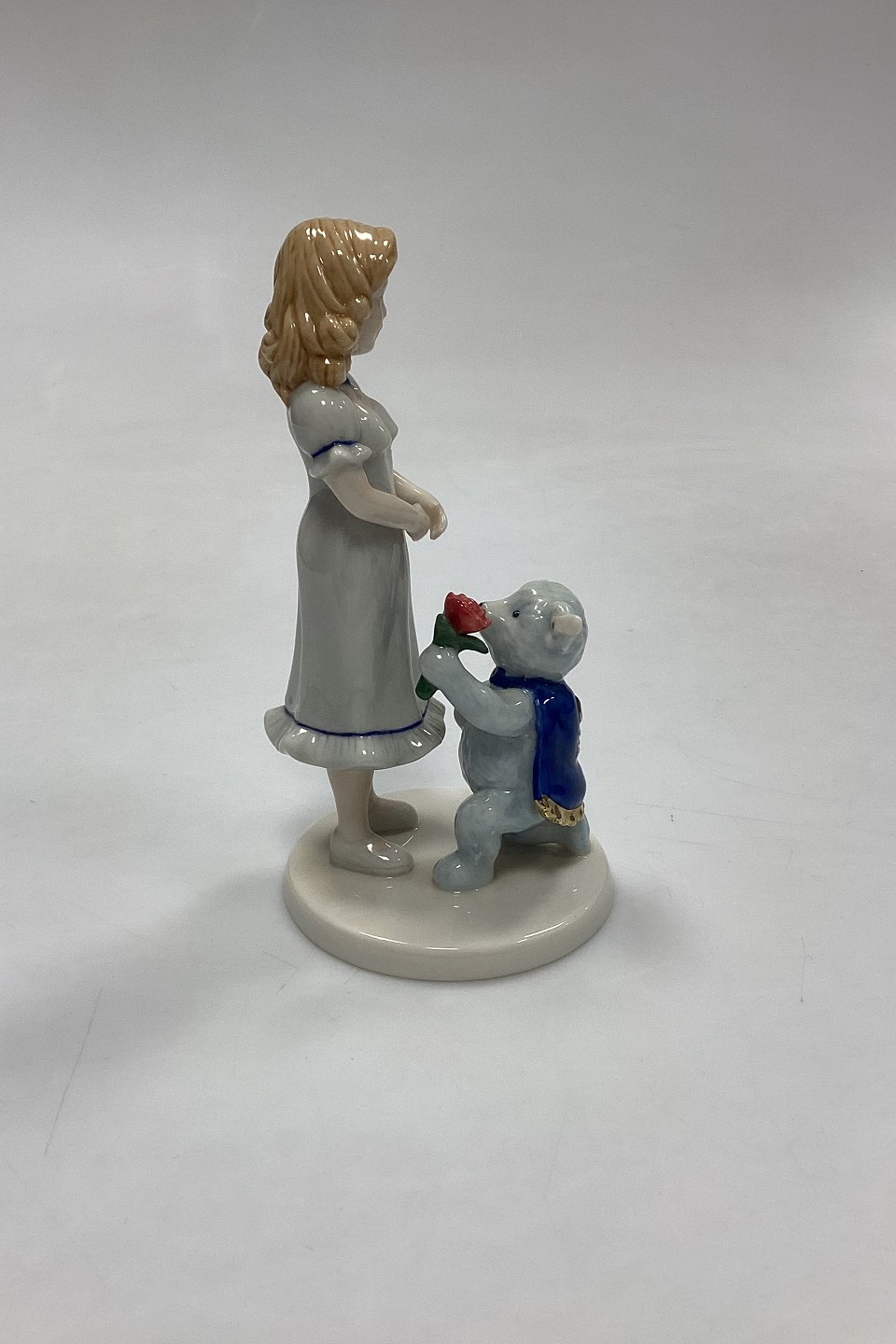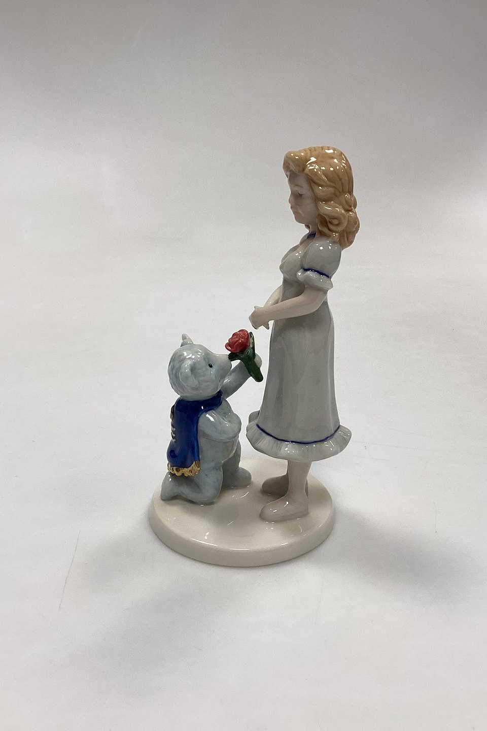 Royal Copenhagen Figur - Snowwhite Rosered. Motiv fra eventyret Snehvid og Rosenrød med Steiff Bamse på frierfødder. Samarbejde mellem de to firmaer med inskriptionen: Snowwhite Rosered Steiff / Button in ear.Måler 13,5 cm / 5,31 in.