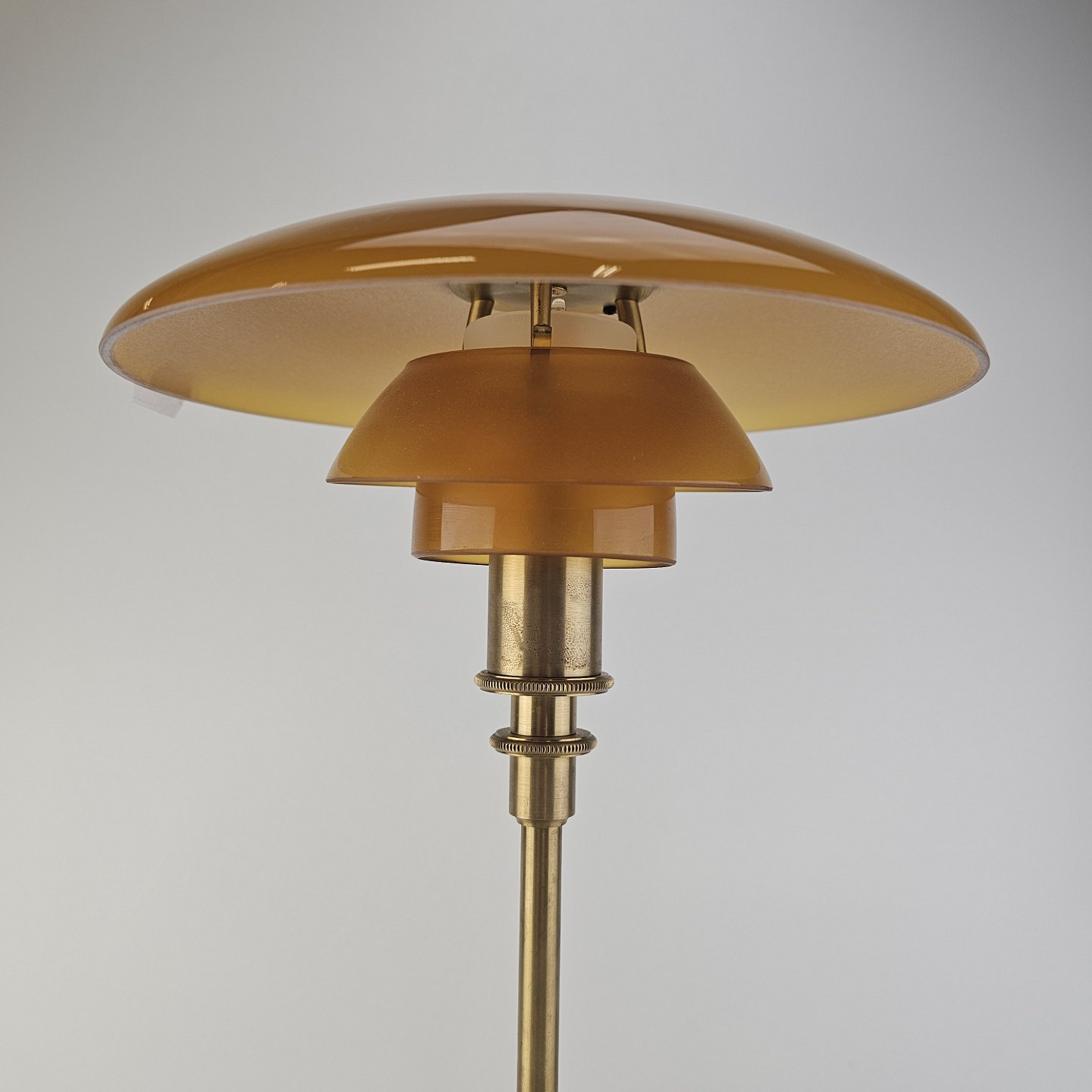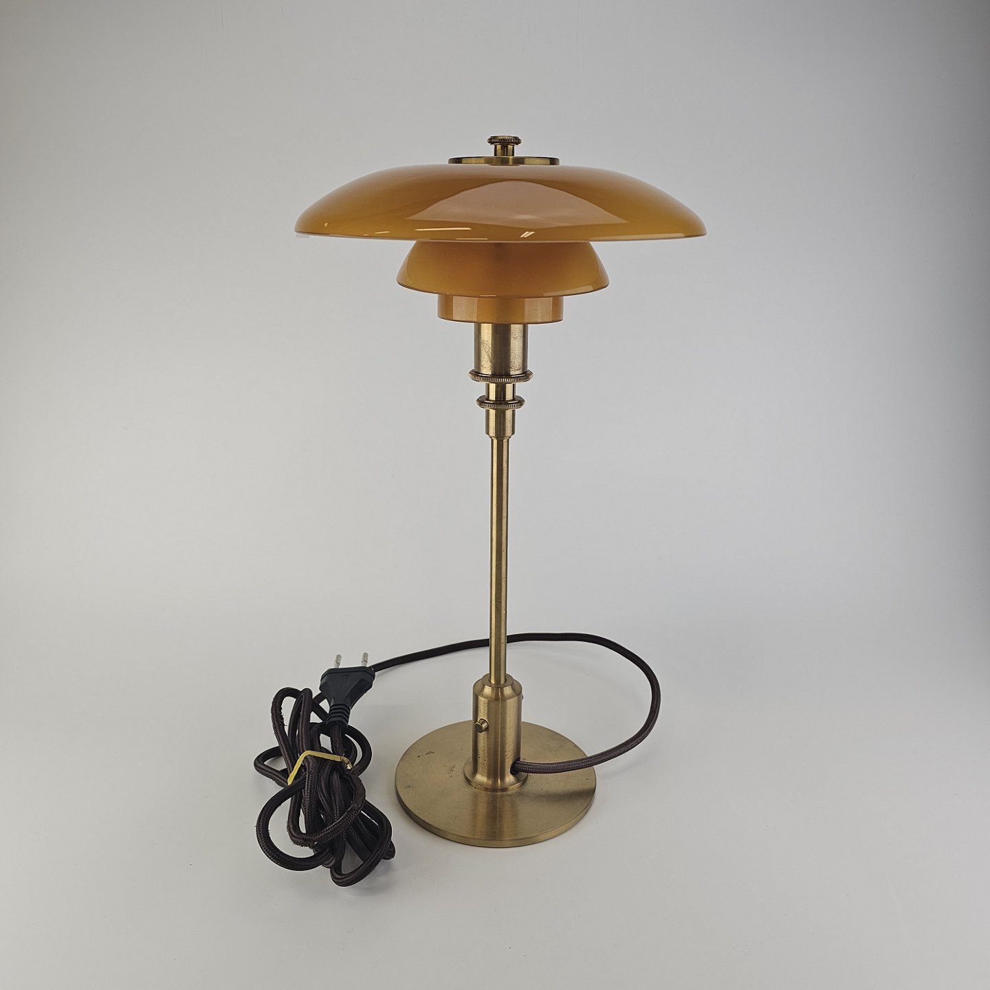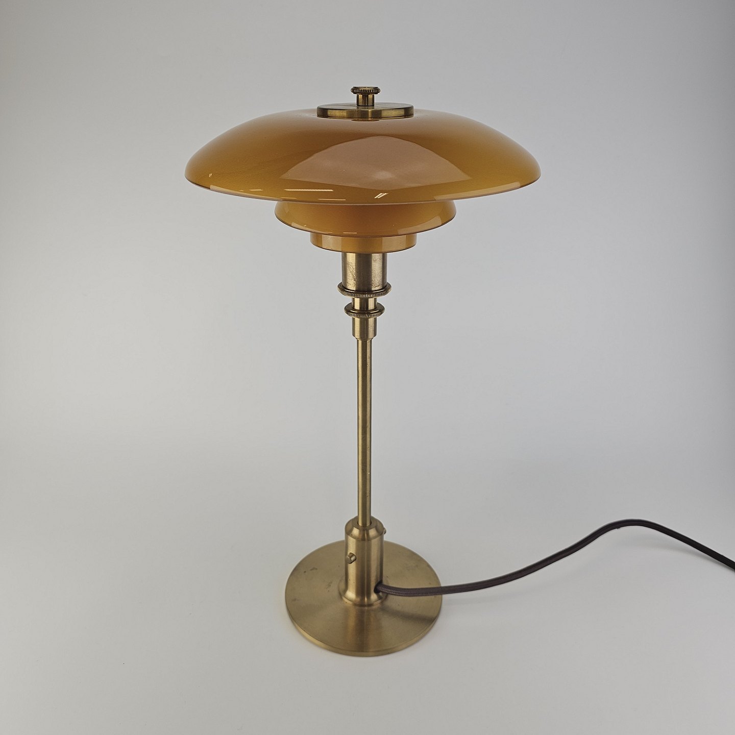 Bordlampe PH 3/2 med skærm af mundblæst ravfarvet etlagsglas og fod af strøgslebet messingDesign Poul Henningsen (1894-1967)