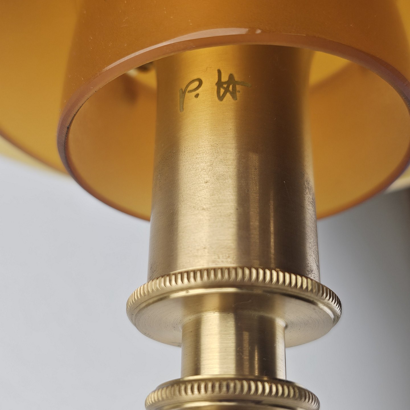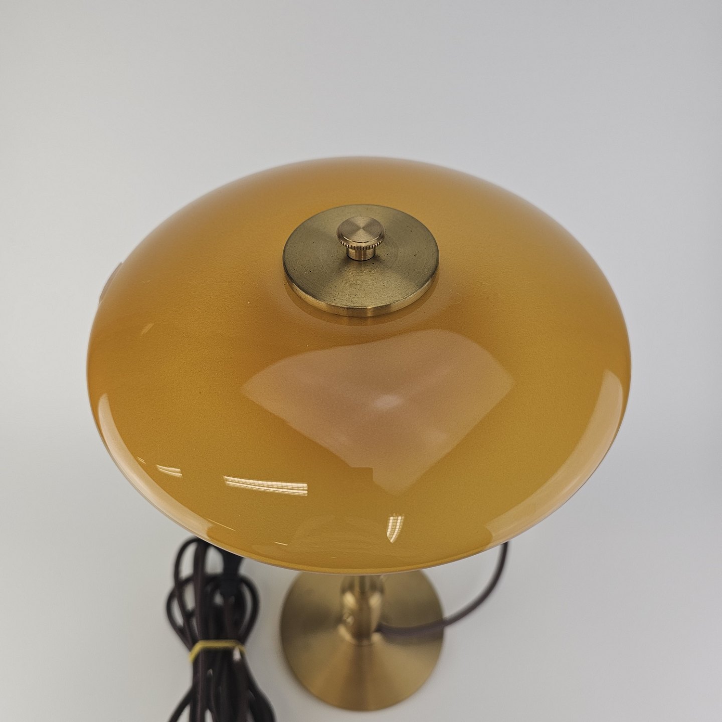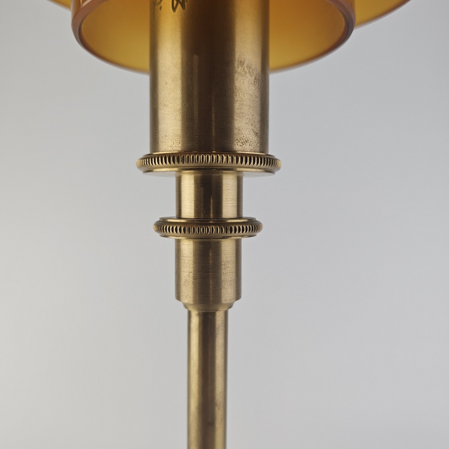 Bordlampe PH 3/2 med skærm af mundblæst ravfarvet etlagsglas og fod af strøgslebet messingDesign Poul Henningsen (1894-1967)