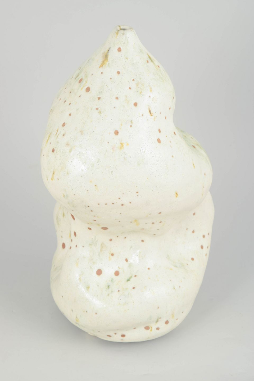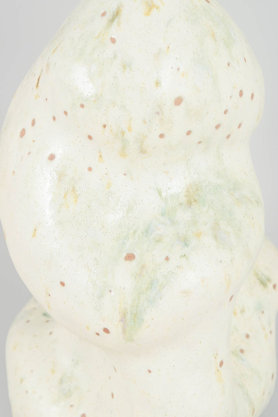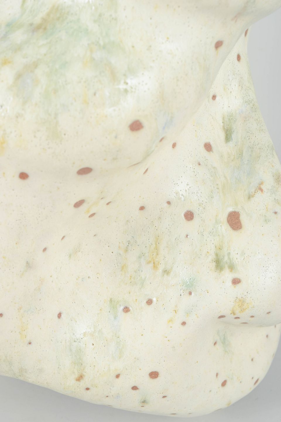 Christina Muff, dansk samtidskeramiker (f. 1971).Unika stentøjsvase, organisk formet. Det varme brune stentøjsler er dækket af et lag cremefarvet glasur med grønlig tone og masser af pletter uden glasur der viser lerets varme tone.