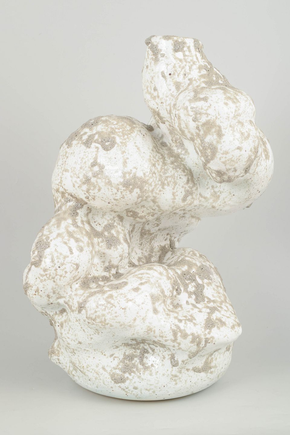 Christina Muff, dansk samtidskeramiker (f. 1971).Høj unika stentøjsvase, organisk formet. Glasuren er en hvid blank med grå, mat glitter glasur, der henleder tankerne på vådt sand.