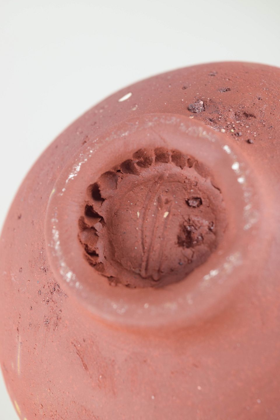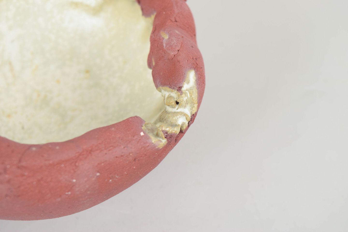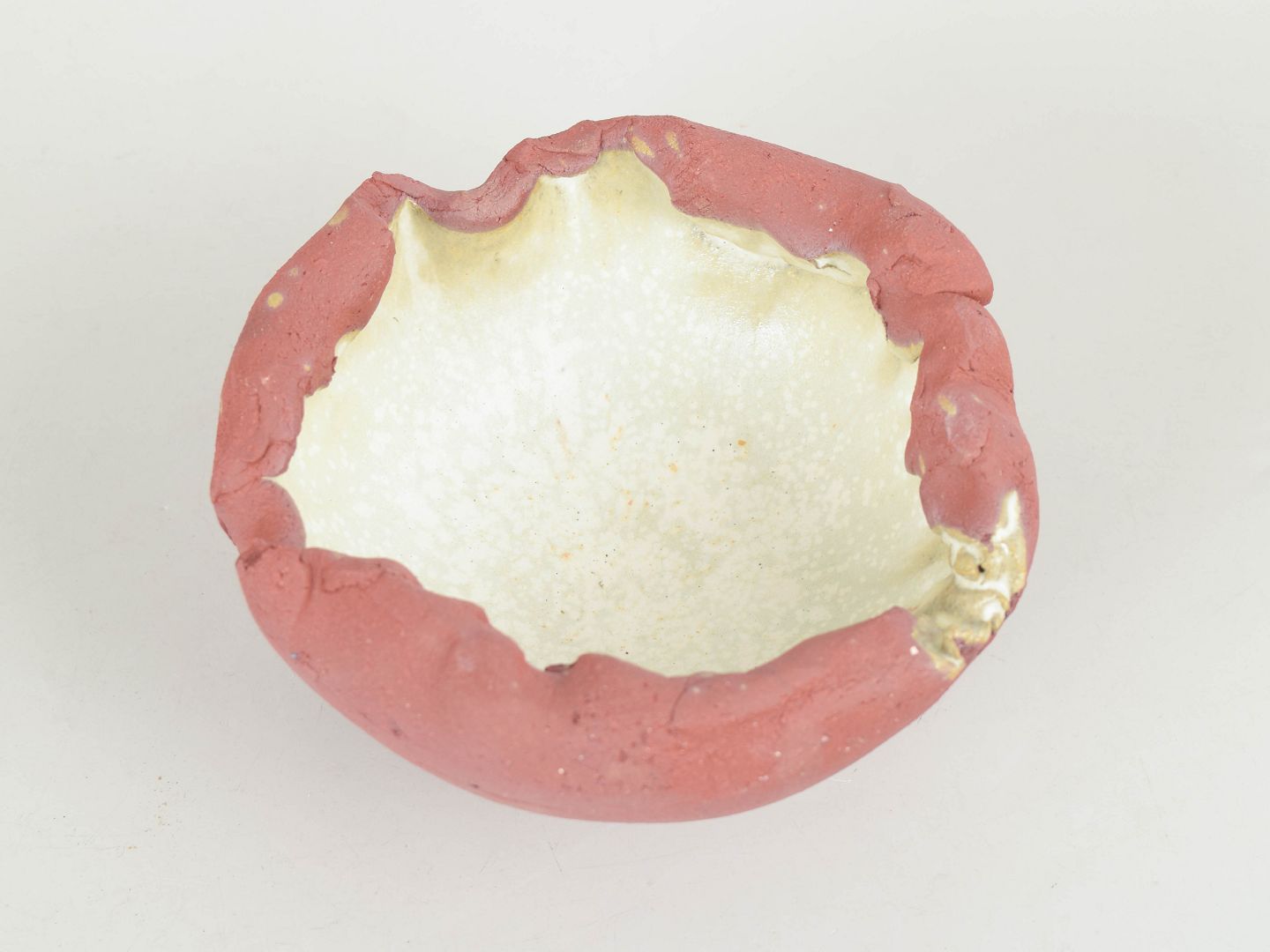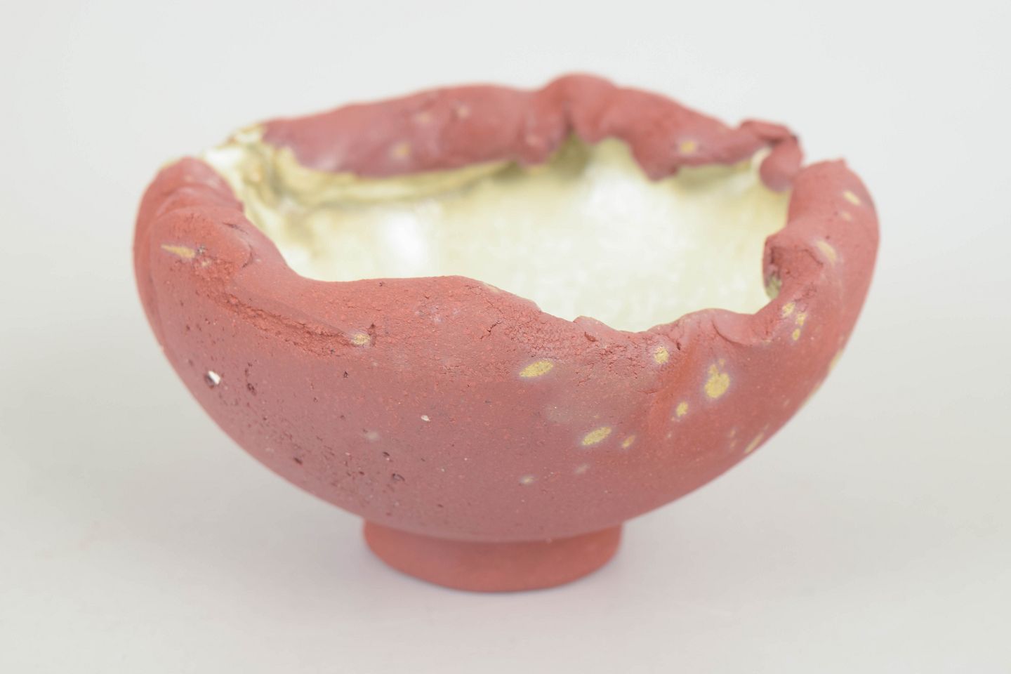 Christina Muff, dansk samtidskeramiker (f. 1971).Lille unika skål i rødt stentøjsler på fod. Uglaseret på ydersiden fremstår den med det røde, varme ler som en kontrast til den cremehvide matte krystalglasur der optræder indvendigt.