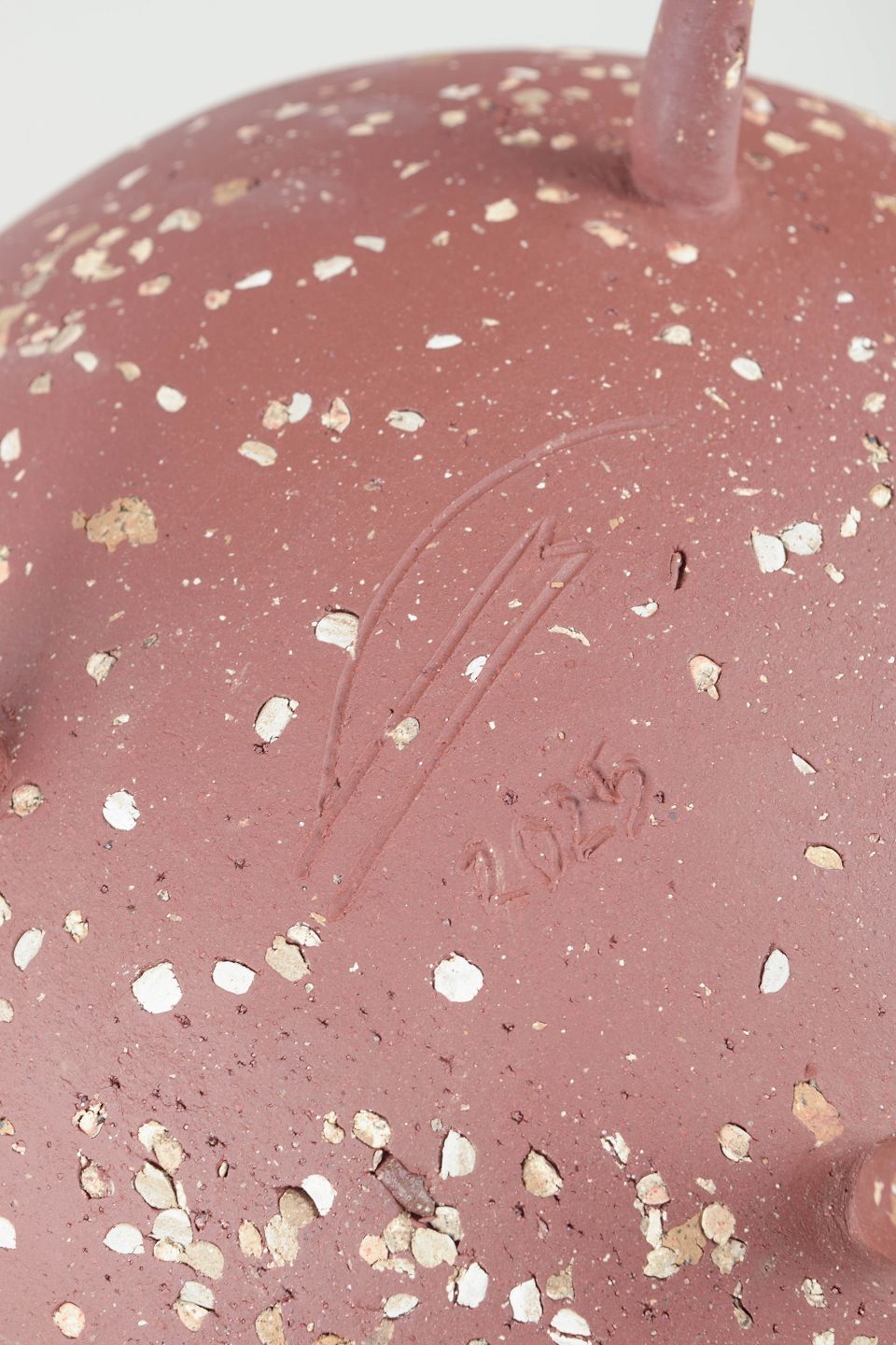 Christina Muff, dansk samtidskeramiker (f. 1971).Unika Skål i rødt stentøjsler på tre spidse ben. Uglaseret på ydersiden fremstår den med det røde, varme ler som en kompliment til den mørke celadonglasur på indersiden af skålen.