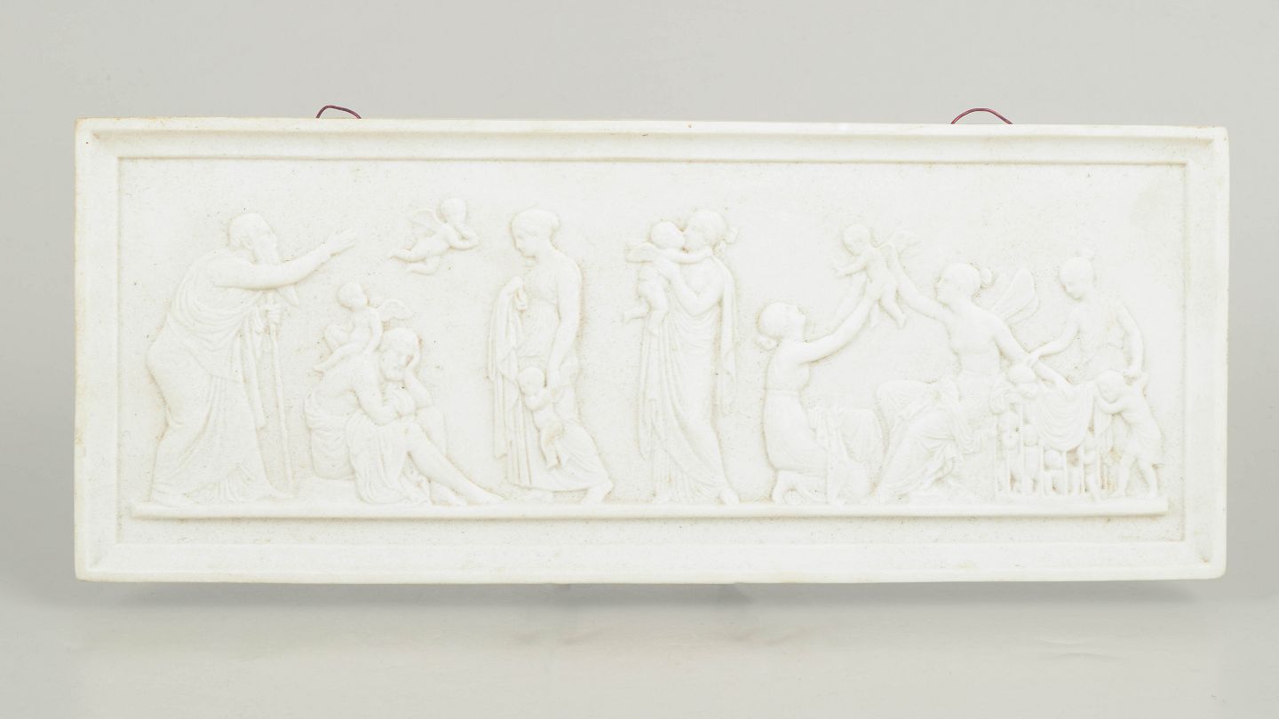 Royal Copenhagen bisquit relief efter Thorvaldsen, vægrelief.Rektangulært vægrelief i hvidt bisquitporcelæn med klassicistisk figurfrise efter Bertel Thorvaldsen, udført med fine detaljer og harmonisk komposition inspireret af antikkens formsprog.