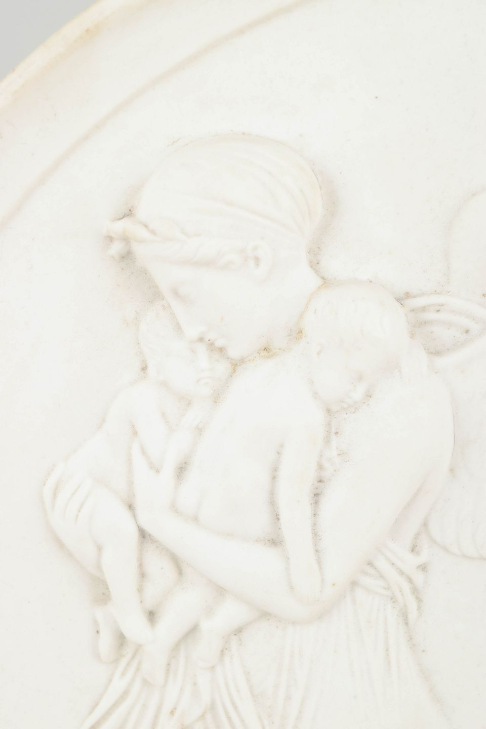 Royal Copenhagen bisquit relief efter Thorvaldsen, vægplakette.Rund vægplakette i hvidt bisquitporcelæn med relief af engelmotiv efter Bertel Thorvaldsen, udført med fine klassicistiske detaljer og blød modellering.