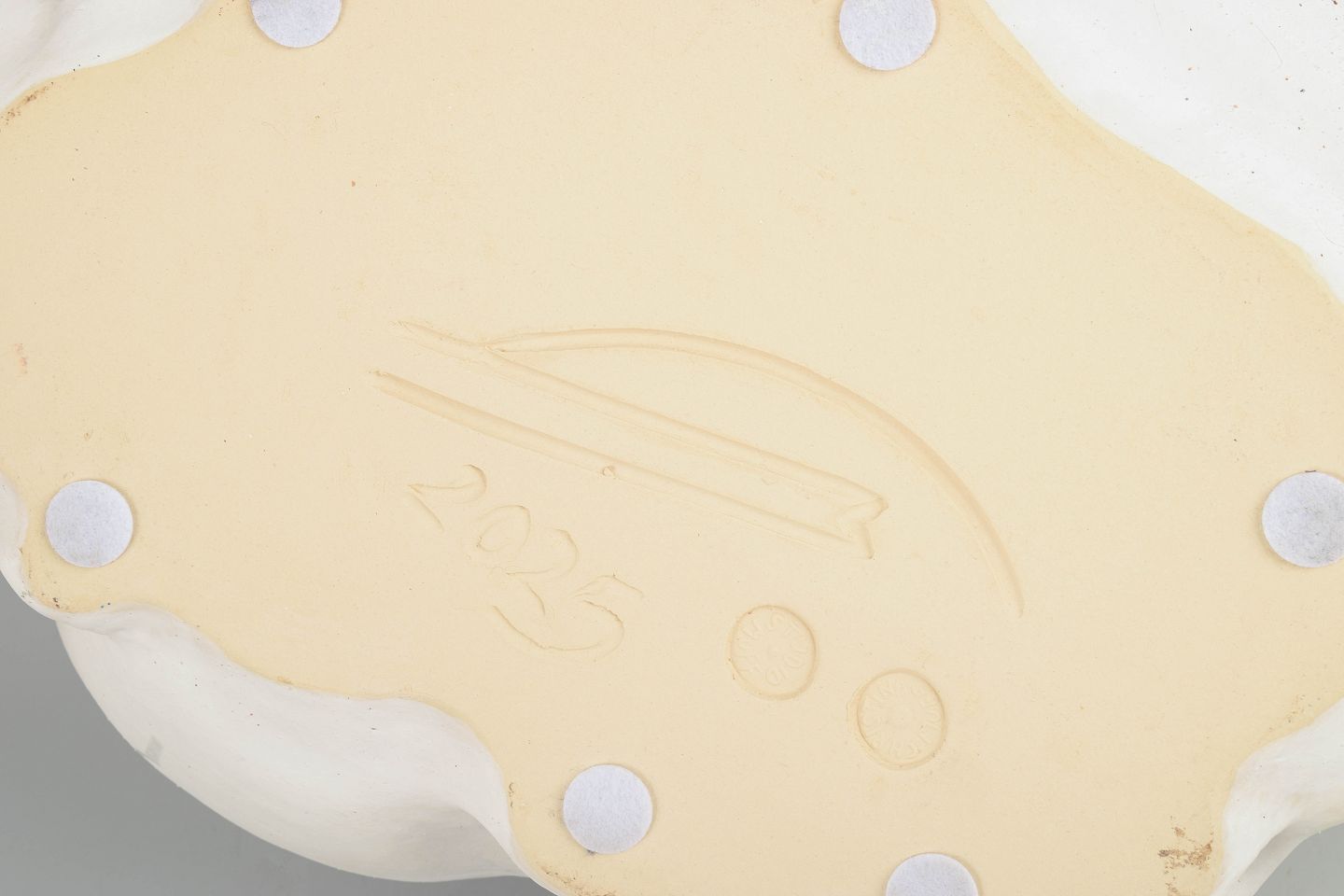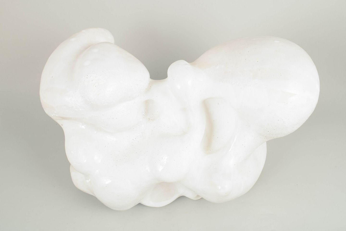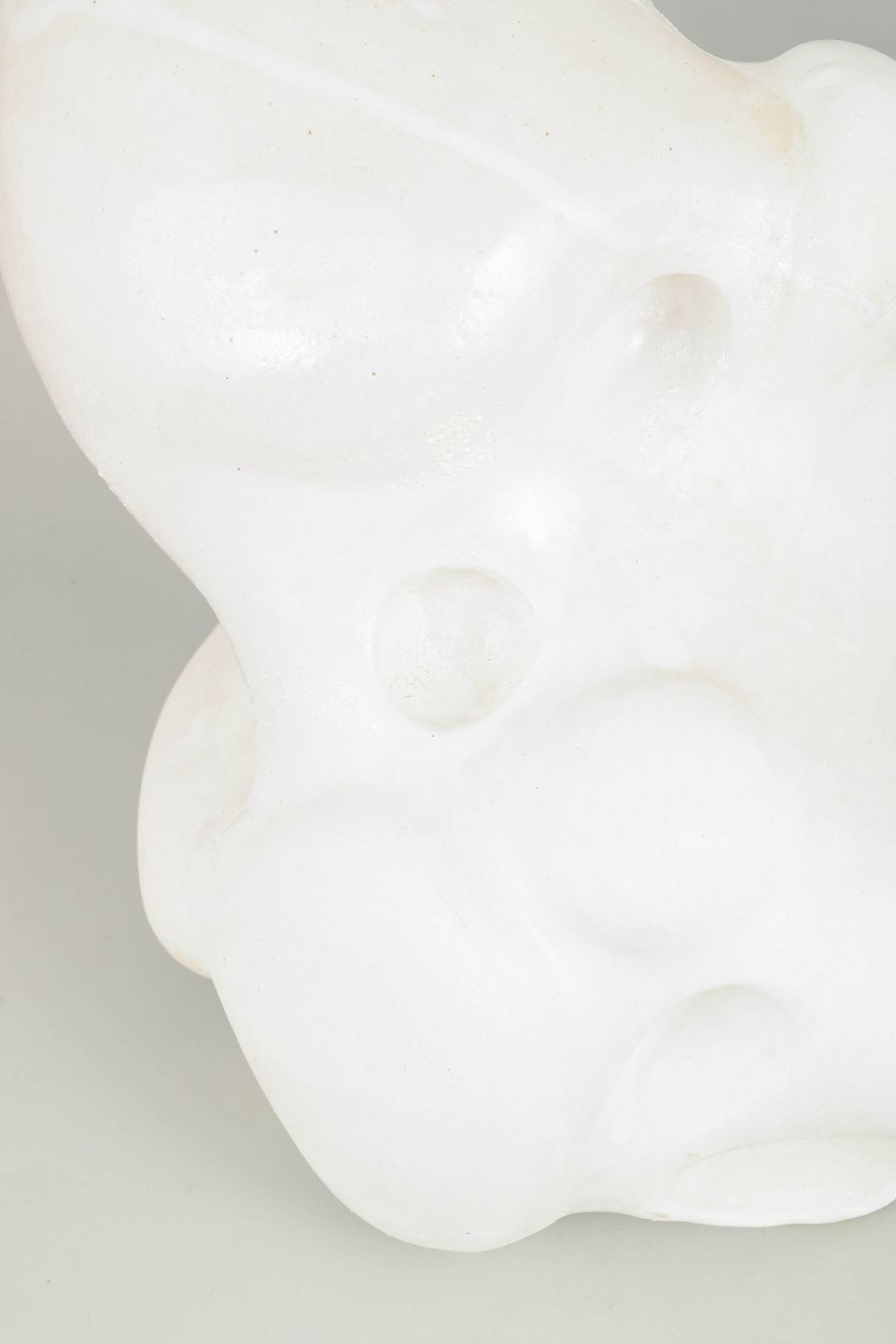 Christina Muff, dansk samtidskeramiker (f. 1971).Unika stentøjsskulptur, organisk formet. Værket er dækket af et tyndt lag mat hvid porcelæn og pletvist penselglaseret med hvid, blank glasur, matte hvide glasurer og hvide glasurer med specielle effekter.