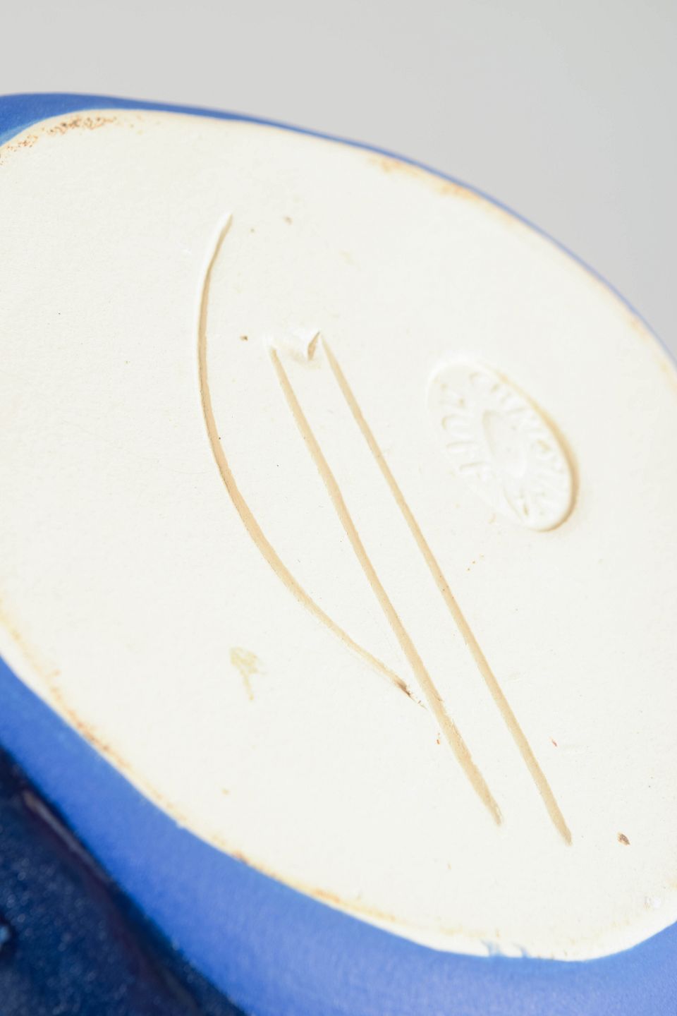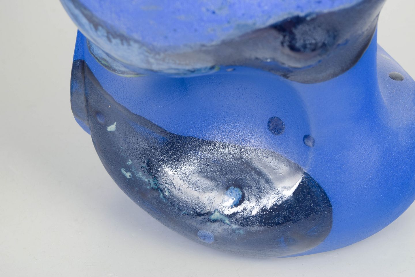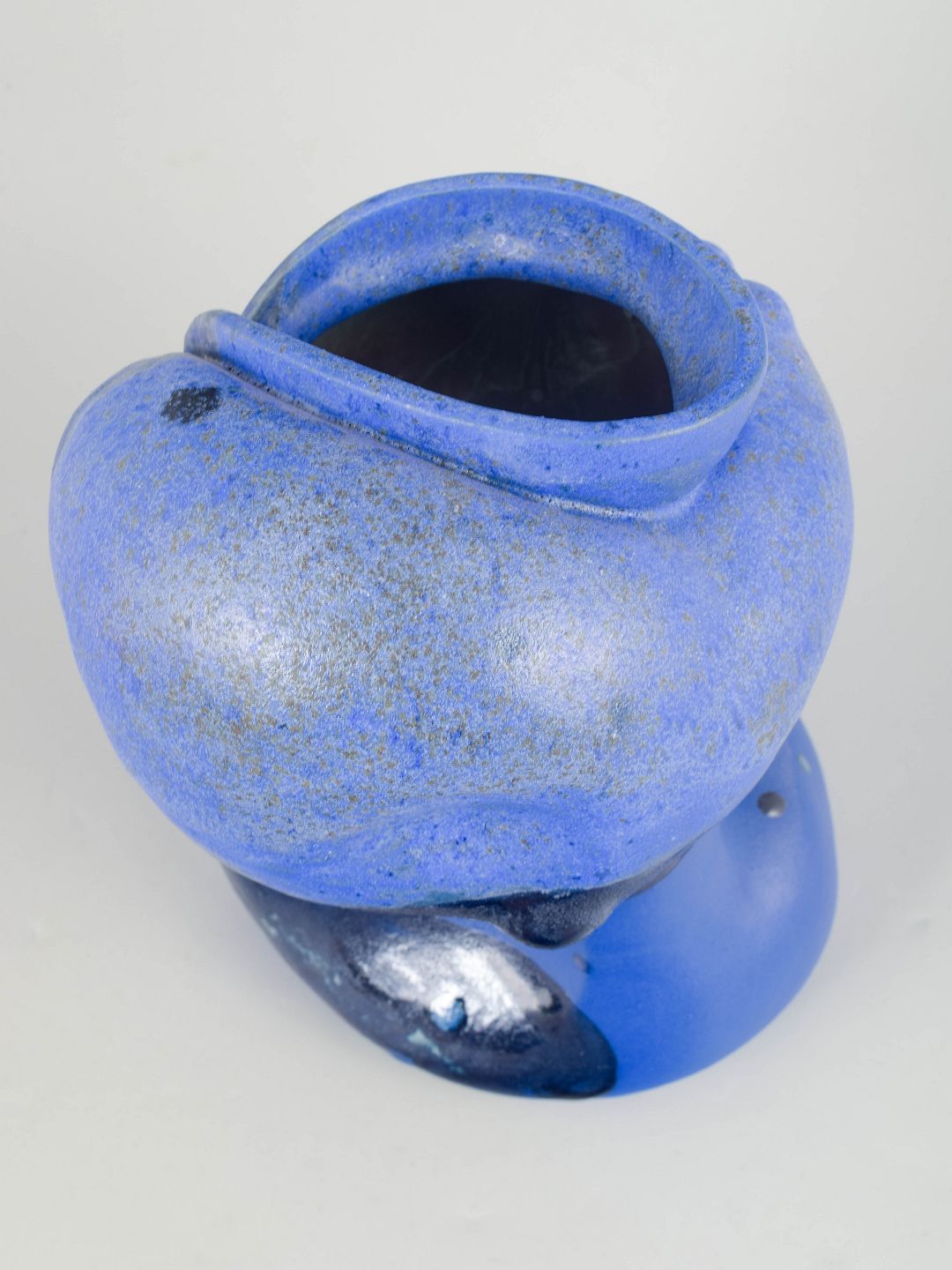 Christina Muff, dansk samtidskeramiker (f. 1971).Unika stentøjsvase, organisk formet. Værket er glaseret i en mange forskellige kongeblå glasurer både blanke og matte