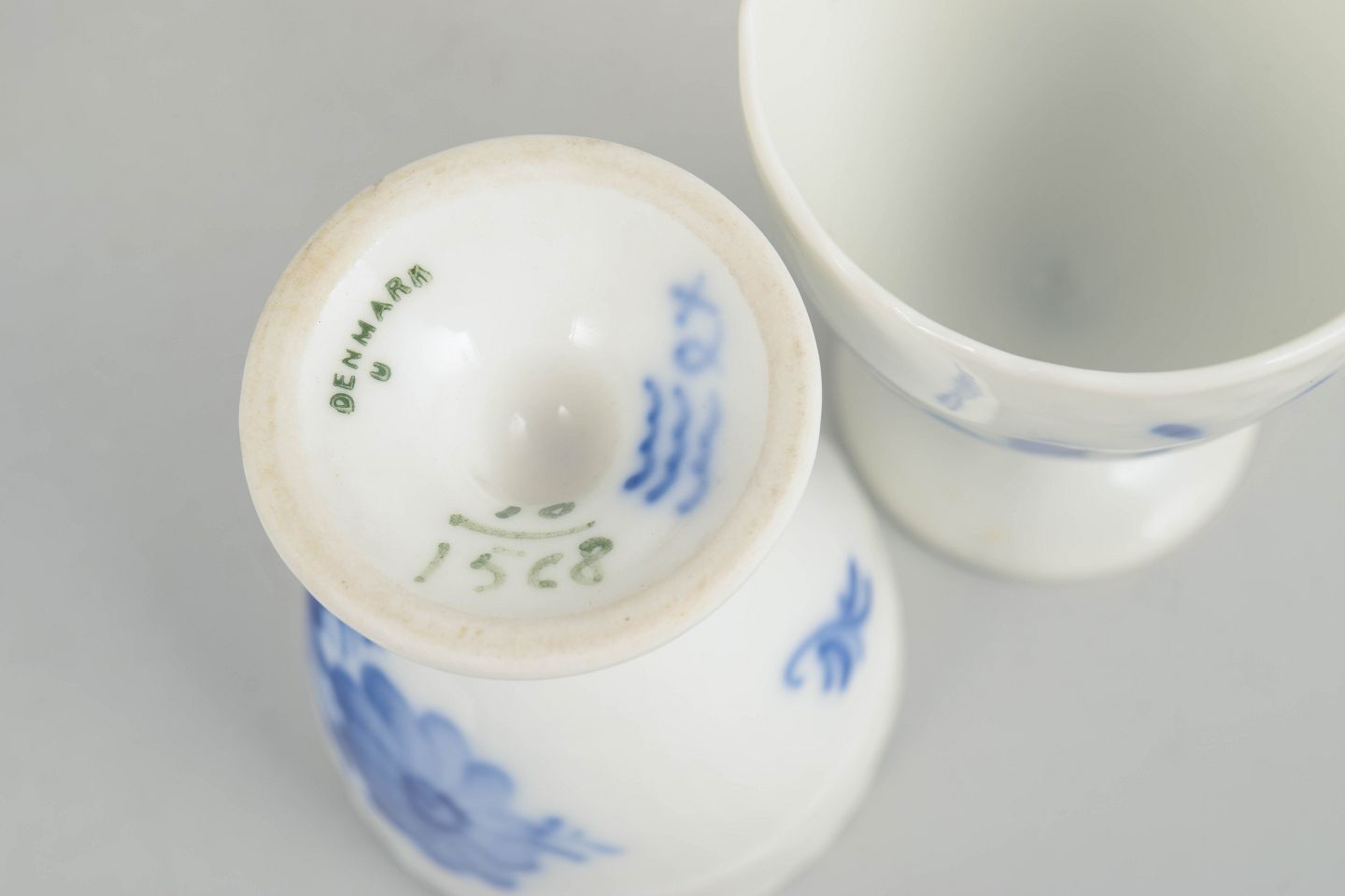 Royal Copenhagen, Blå Blomst Svejset sæt af tre æggebægre.Sæt bestående af tre æggebægre i porcelæn med håndmalet blå blomsterdekoration i relief. Modelnummer 10/1568, 1. sortering, fra tidligt 1900-tal.