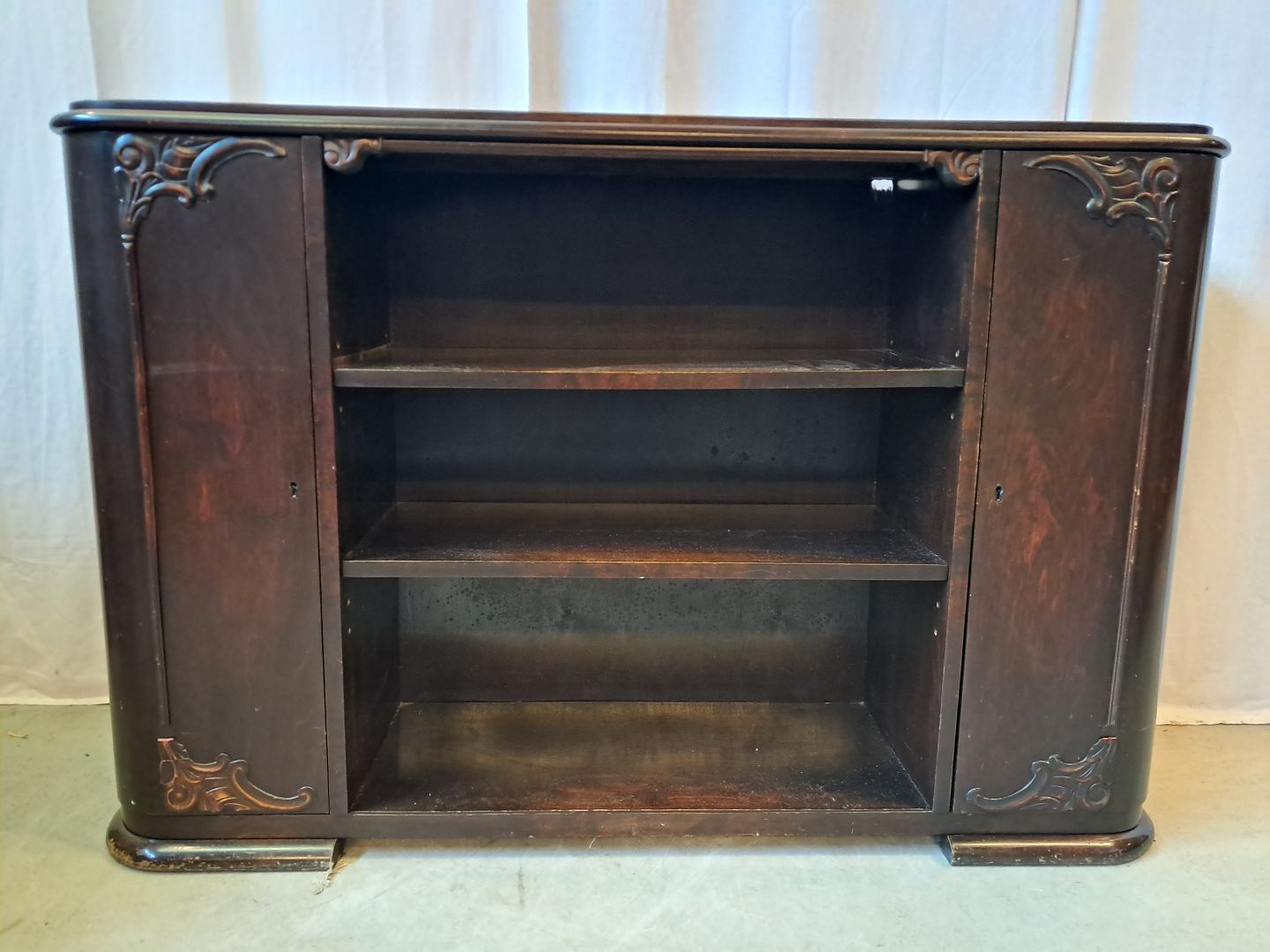 Reol i fineret birketræ, fra 1930erne.Den har en finer defekt og 2 defekter på prydlisterne. (se foto)