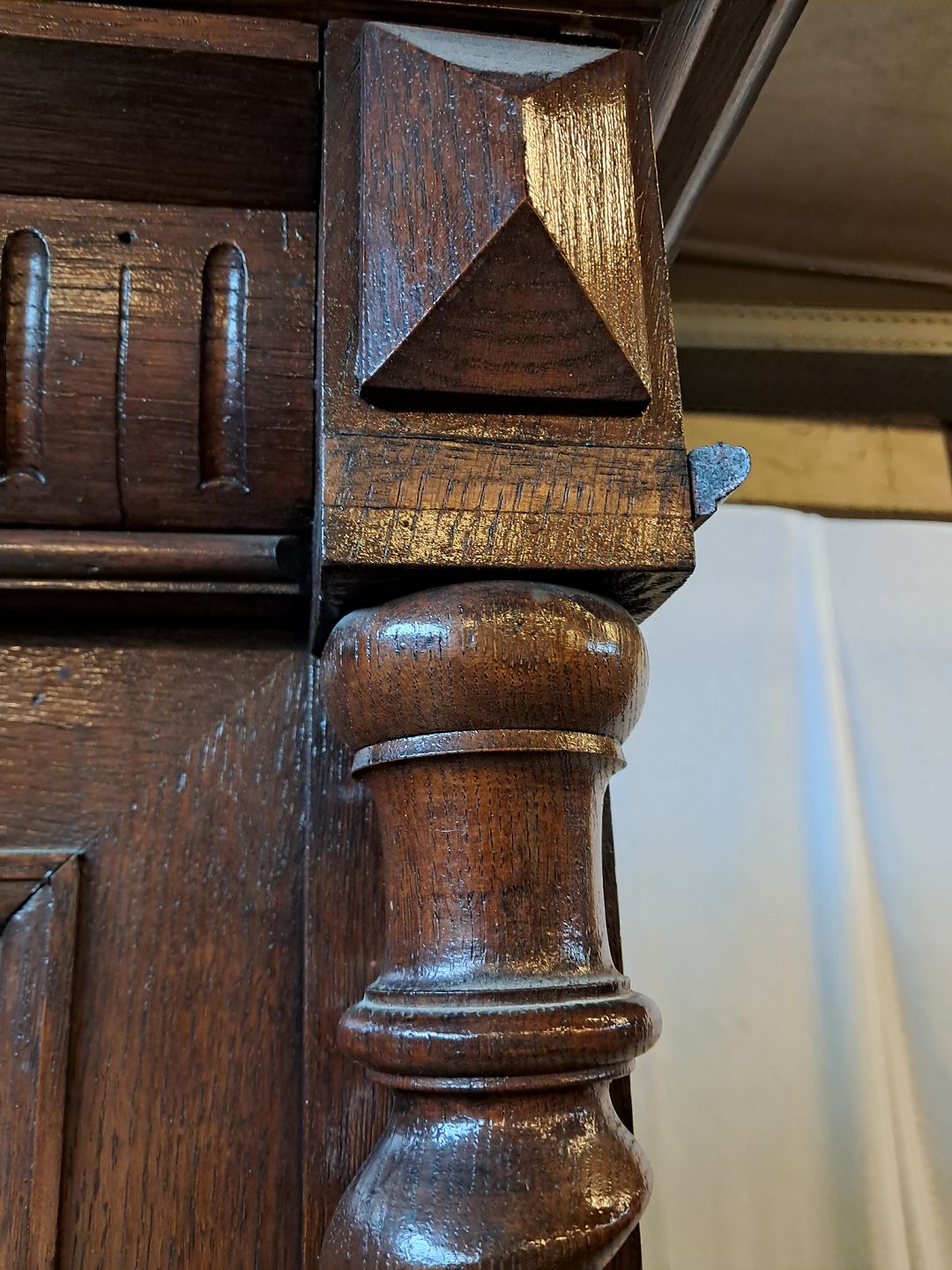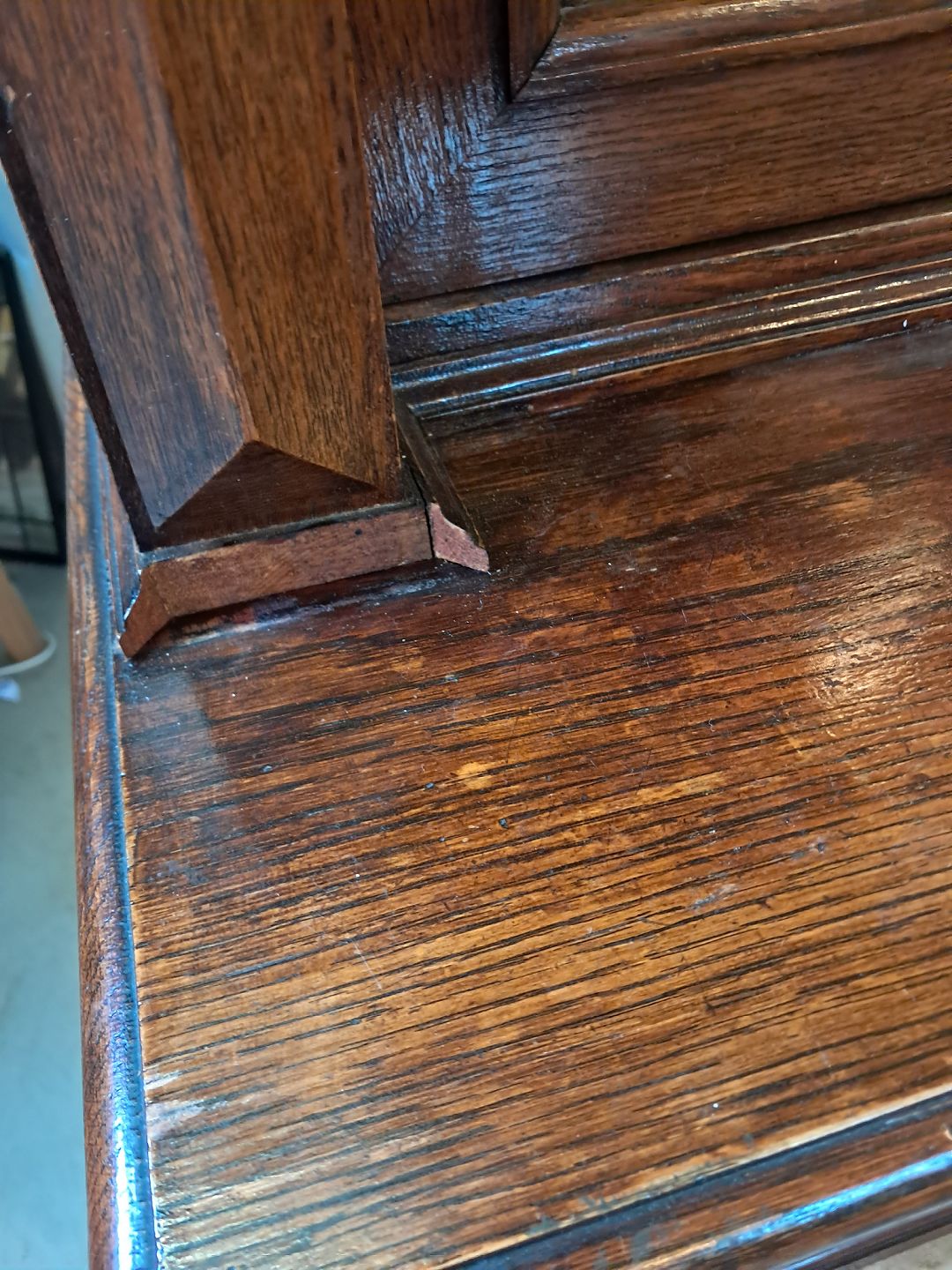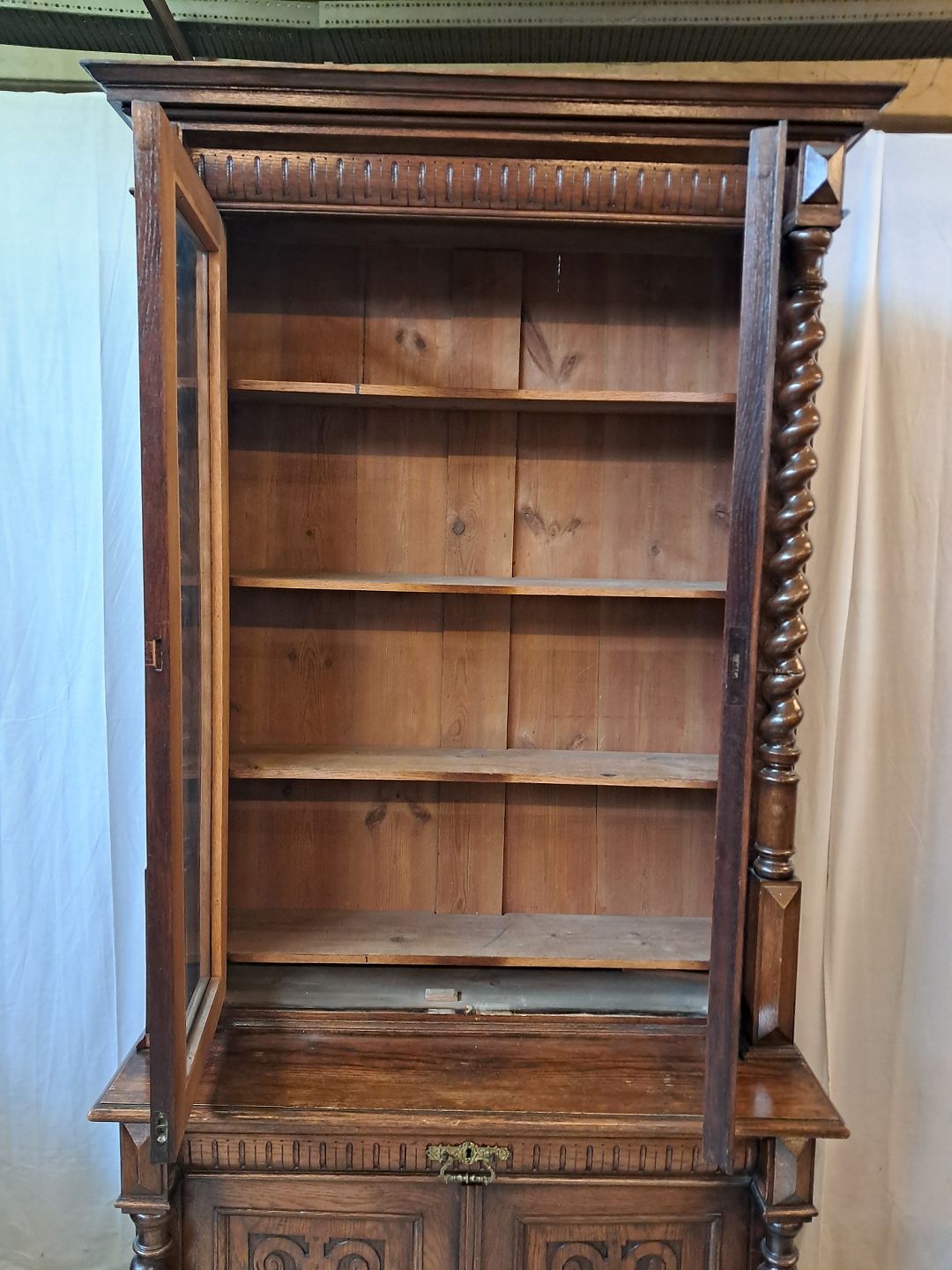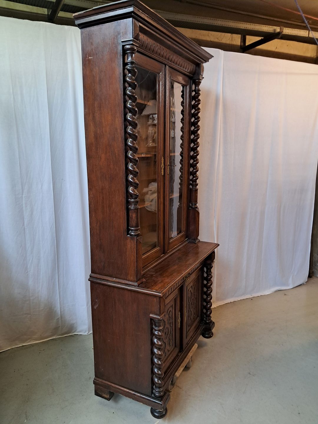 Skab med vitrineoverdel i massivt og fineret egetræ, fra 1900erne.De har brugsspor og mangler et par lister. (se foto)