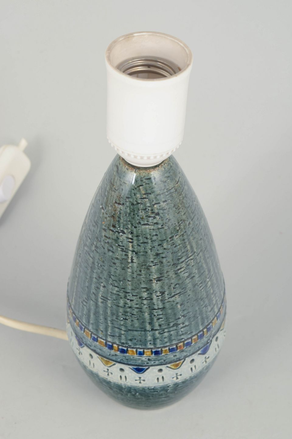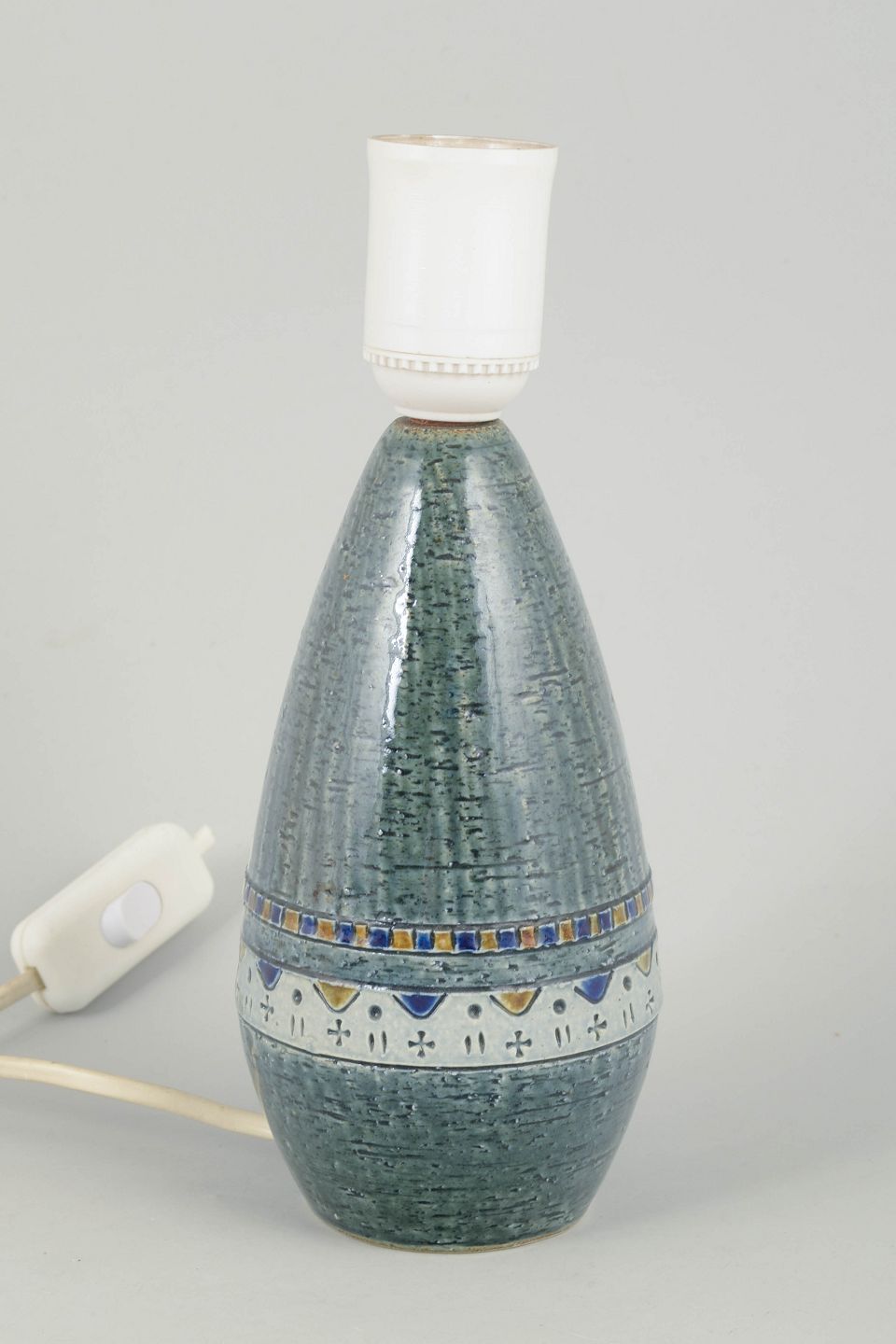 Yngve Blixt for Höganäs, bordlampe.Dekorativ bordlampe i stentøj med karakteristisk reliefmønster og grøn glasur, monteret med lys fatning. Kort ledning uden stik.