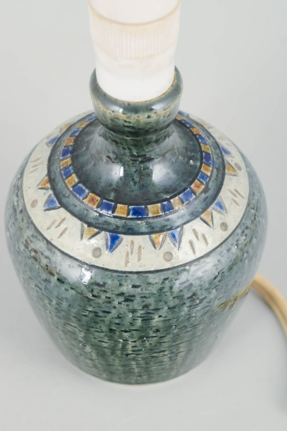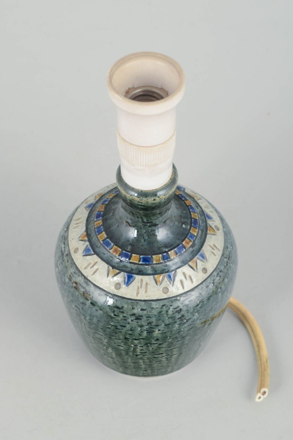 Yngve Blixt for Höganäs, bordlampe.Dekorativ lille bordlampe i stentøj med karakteristisk reliefmønster og grøn glasur, monteret med lys fatning. Kort ledning uden stik.