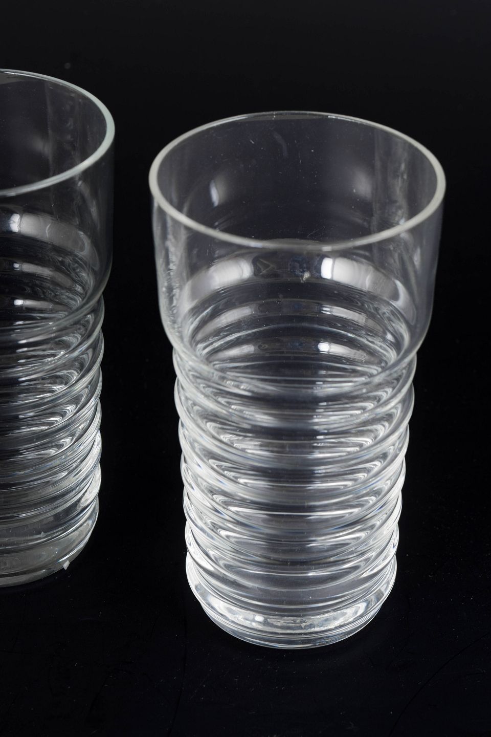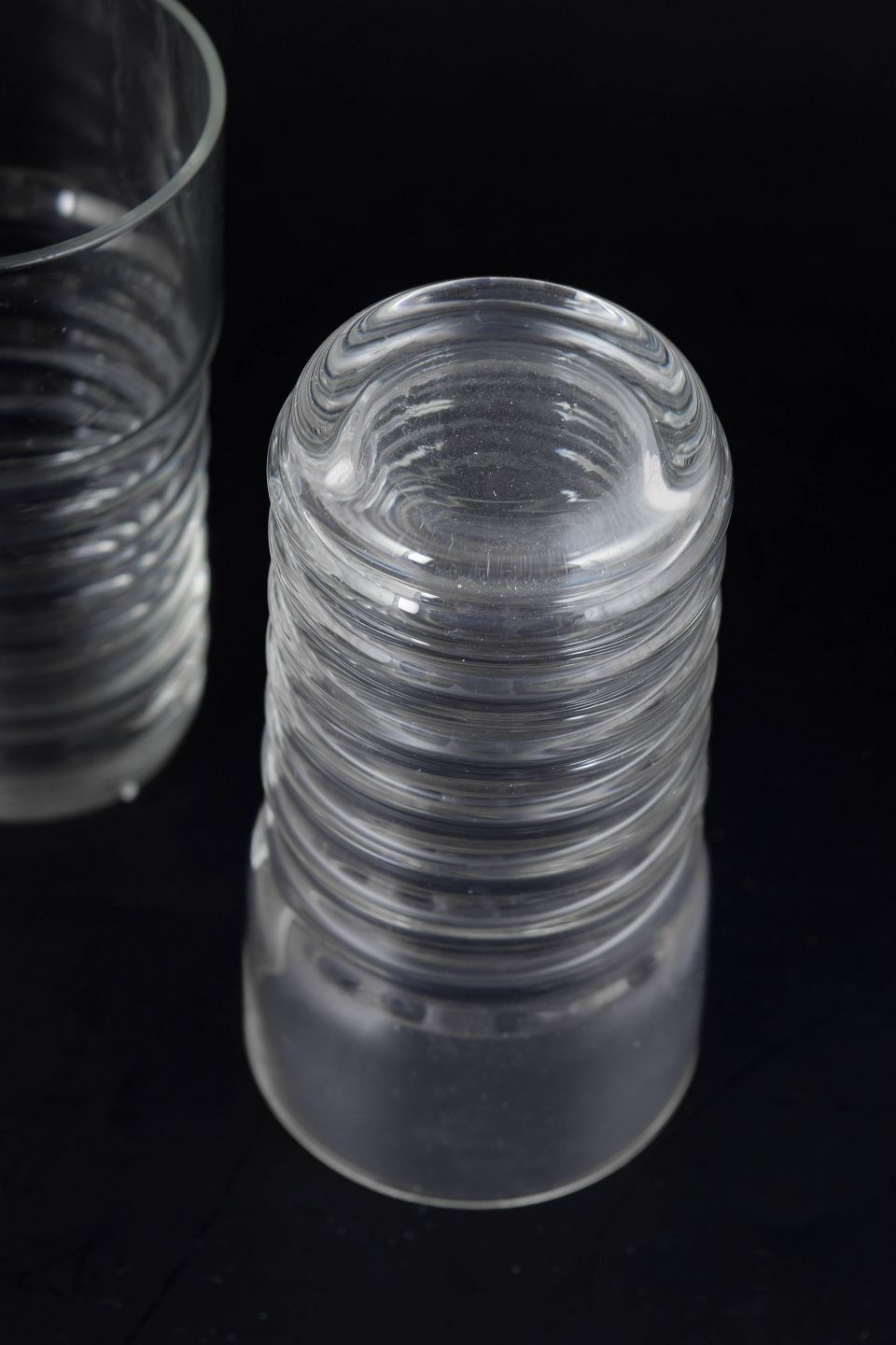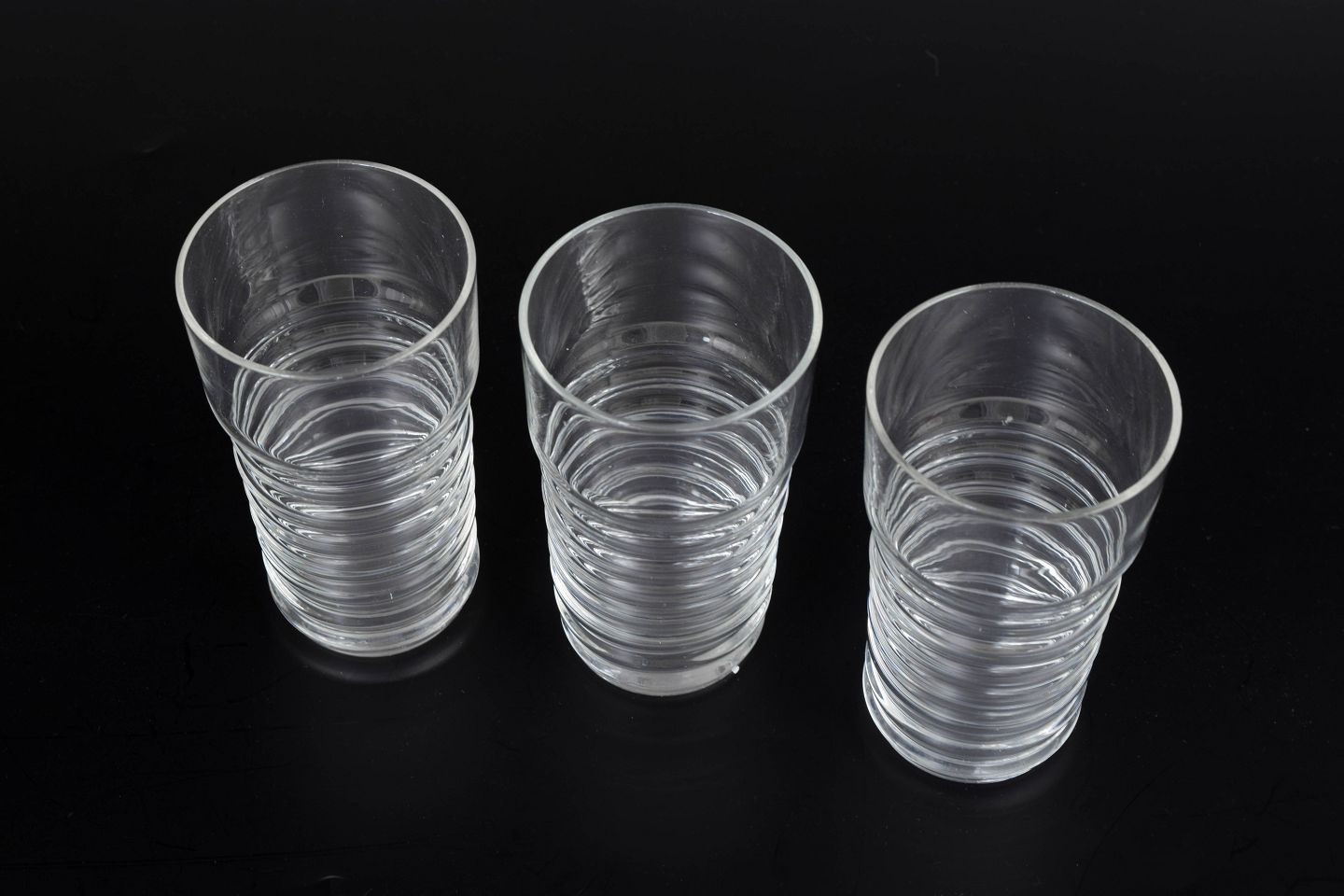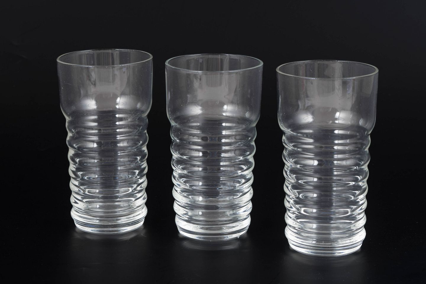 Nanny Still for Riihimäen Lasi, sæt af tre små drikkeglas.Klar glas i Perpetum Mobile serien med karakteristisk rillet struktur og cylindrisk form.