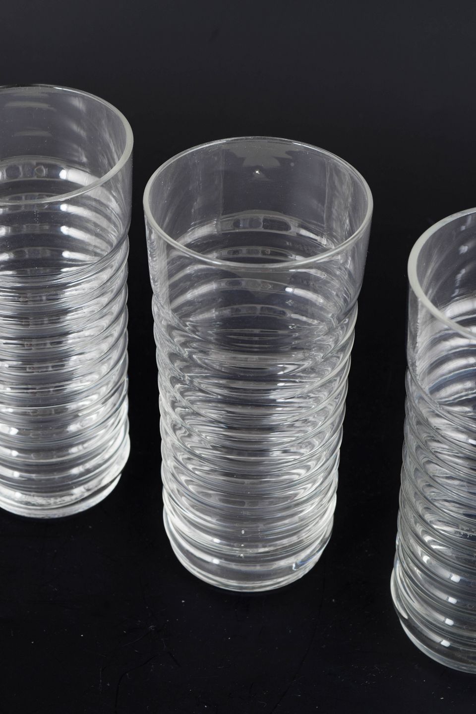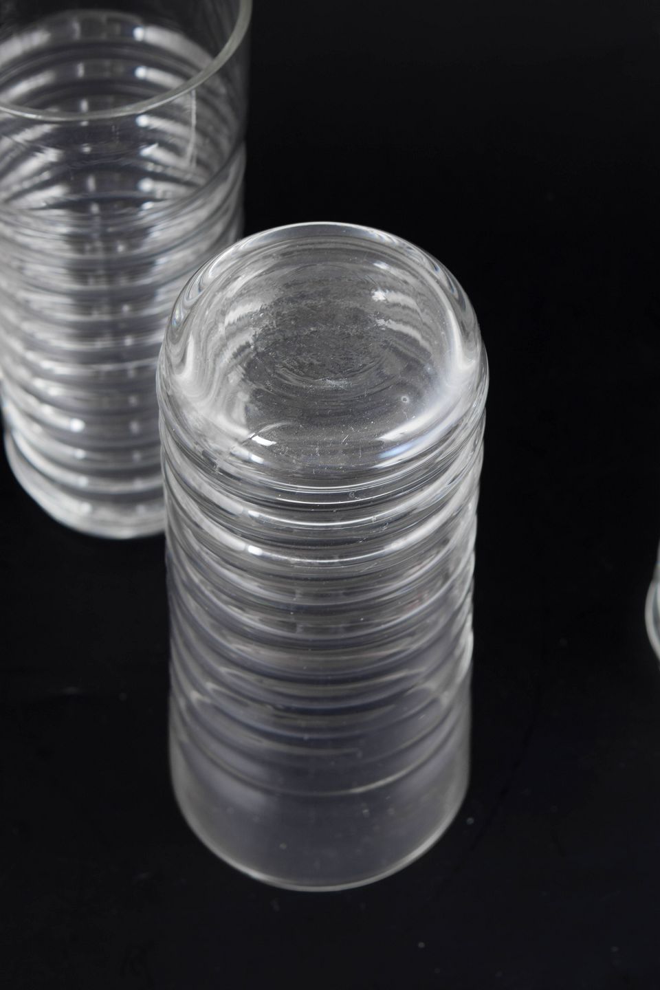 Klar glas i Perpetum Mobile serien med karakteristisk rillet struktur og cylindrisk form.