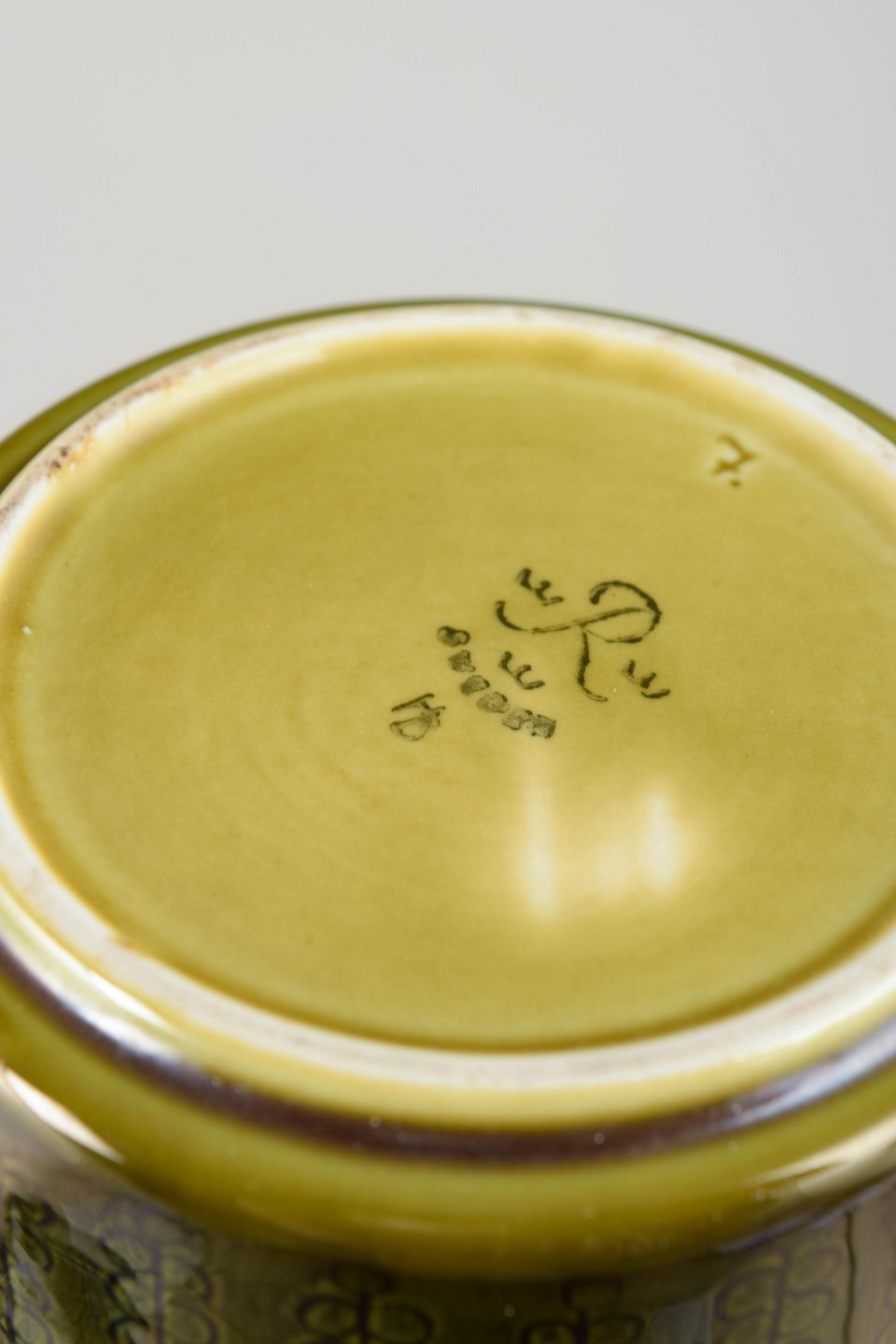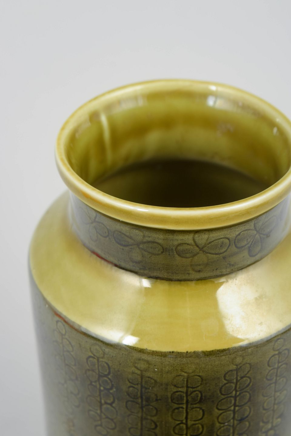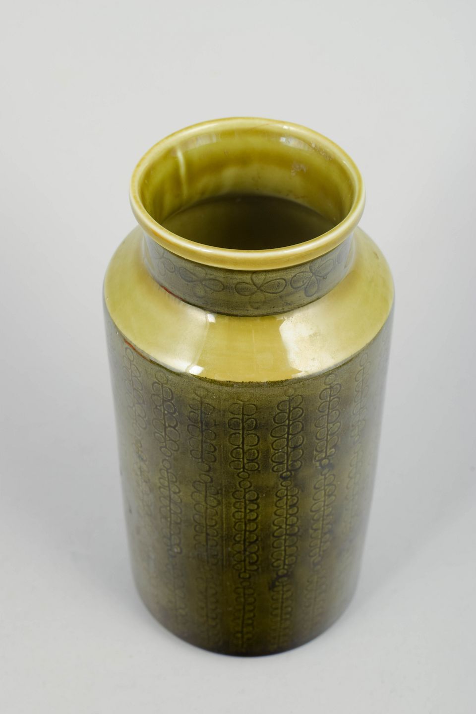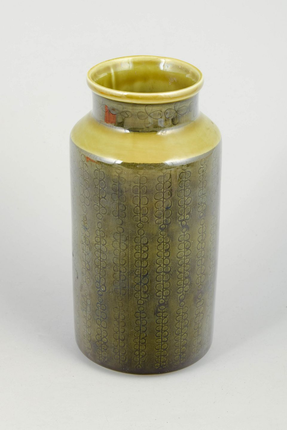 Hertha Bengtsson for Rörstrand, vase.Cylindrisk stentøjsvase med slank form og let udadbøjet hals. Dekoreret med grafisk mønster i dæmpede toner under blank glasur med gul nuance ved randen, karakteristisk for Rörstrands produktion i midten af det 20. århundrede.