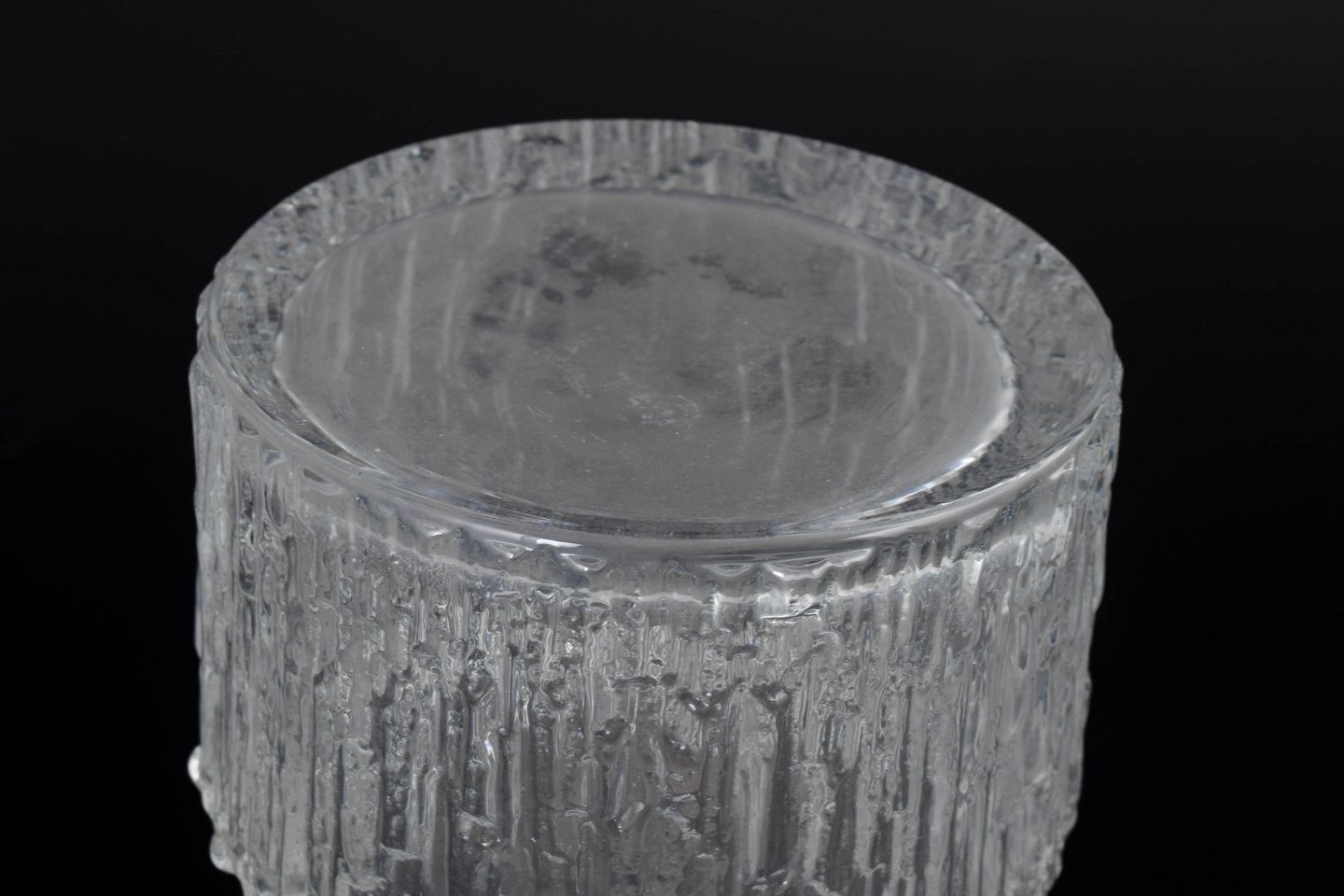 Klar glasvase med karakteristisk isstruktureret overflade og reliefdekor, der minder om smeltende is. Cylindrisk form med let udadbøjet kant. Fabriksmærkat bevaret.