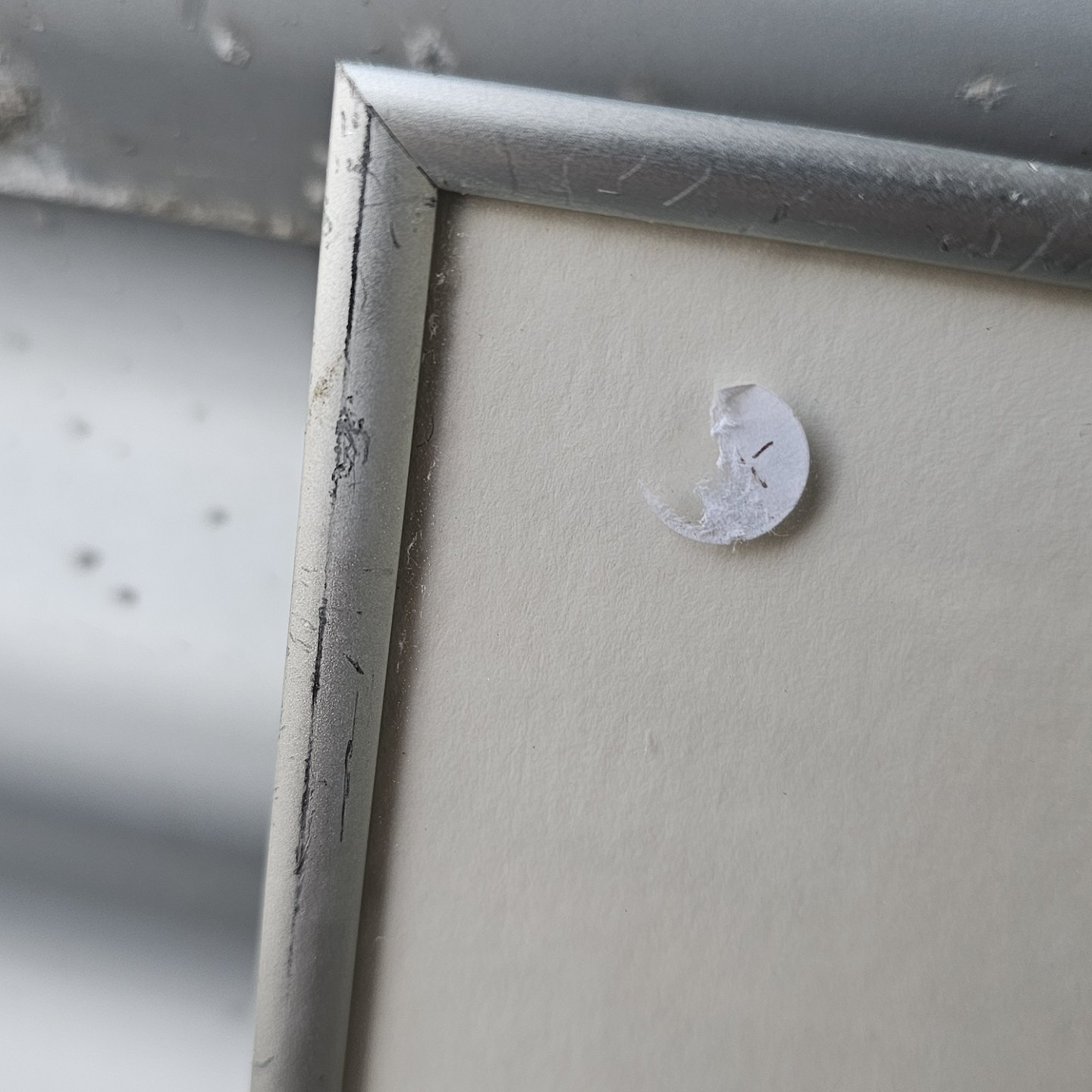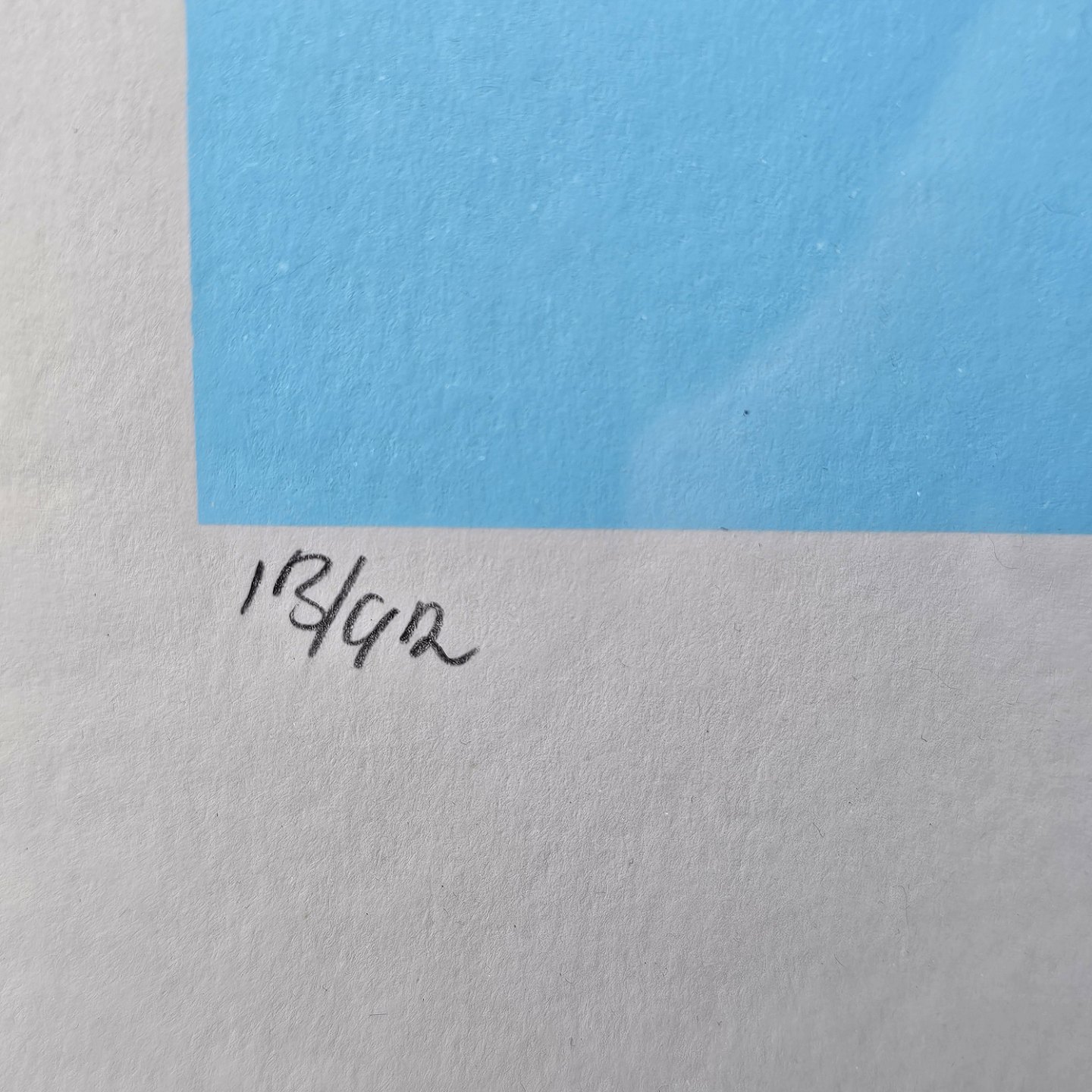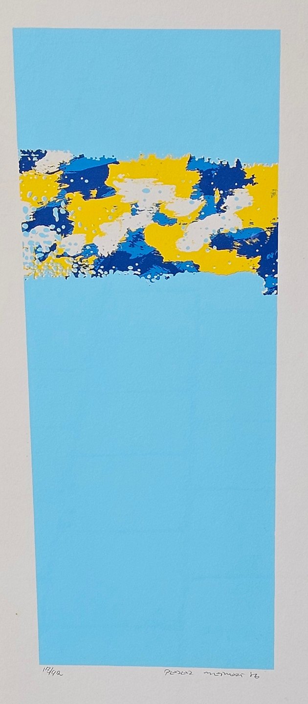 Litografi med blå, hvide og gule farver på lyseblå baggrund i metal ramme. 13/92Signeret Peder Meinert 16