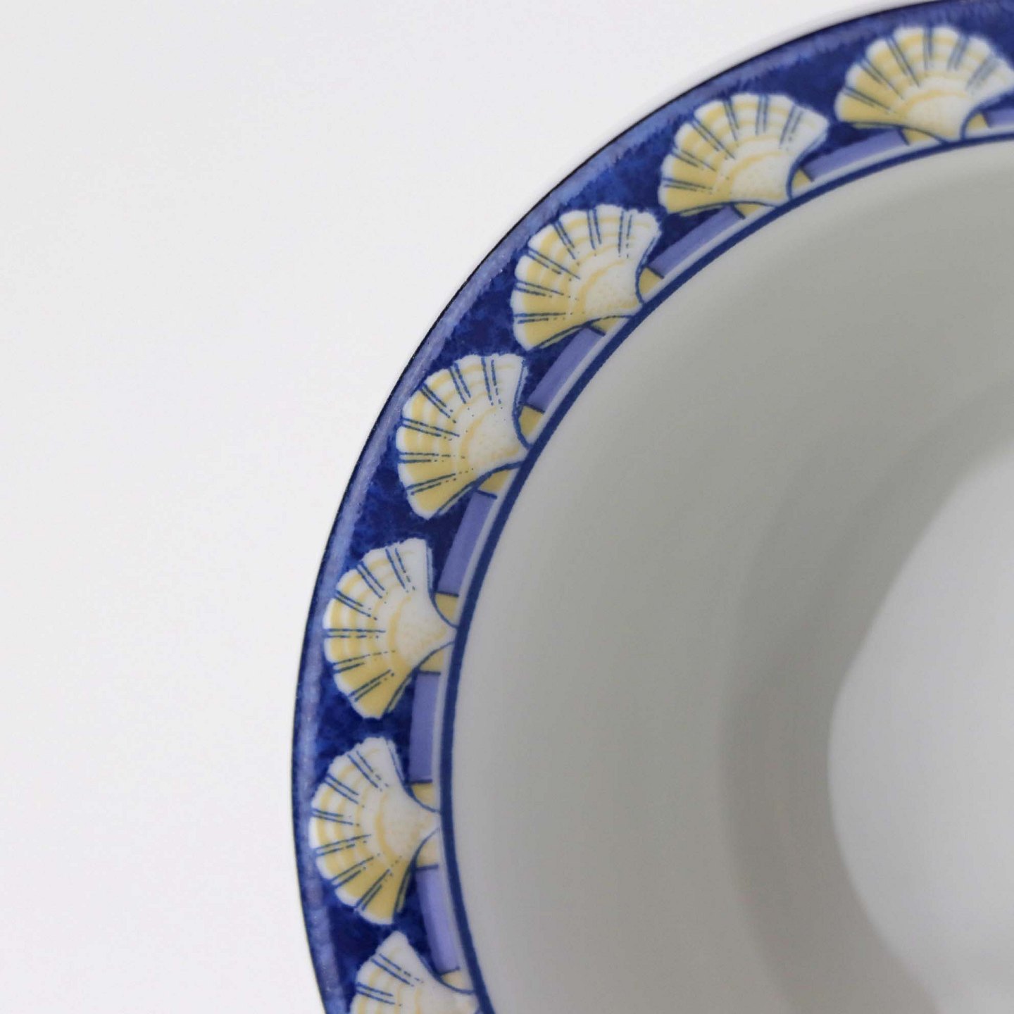 Service i glat hvid porcelæn med blåt bånd og dekoration af gule vifteformede strandskaller. Stellet kan gå i opvaskemaskinen.