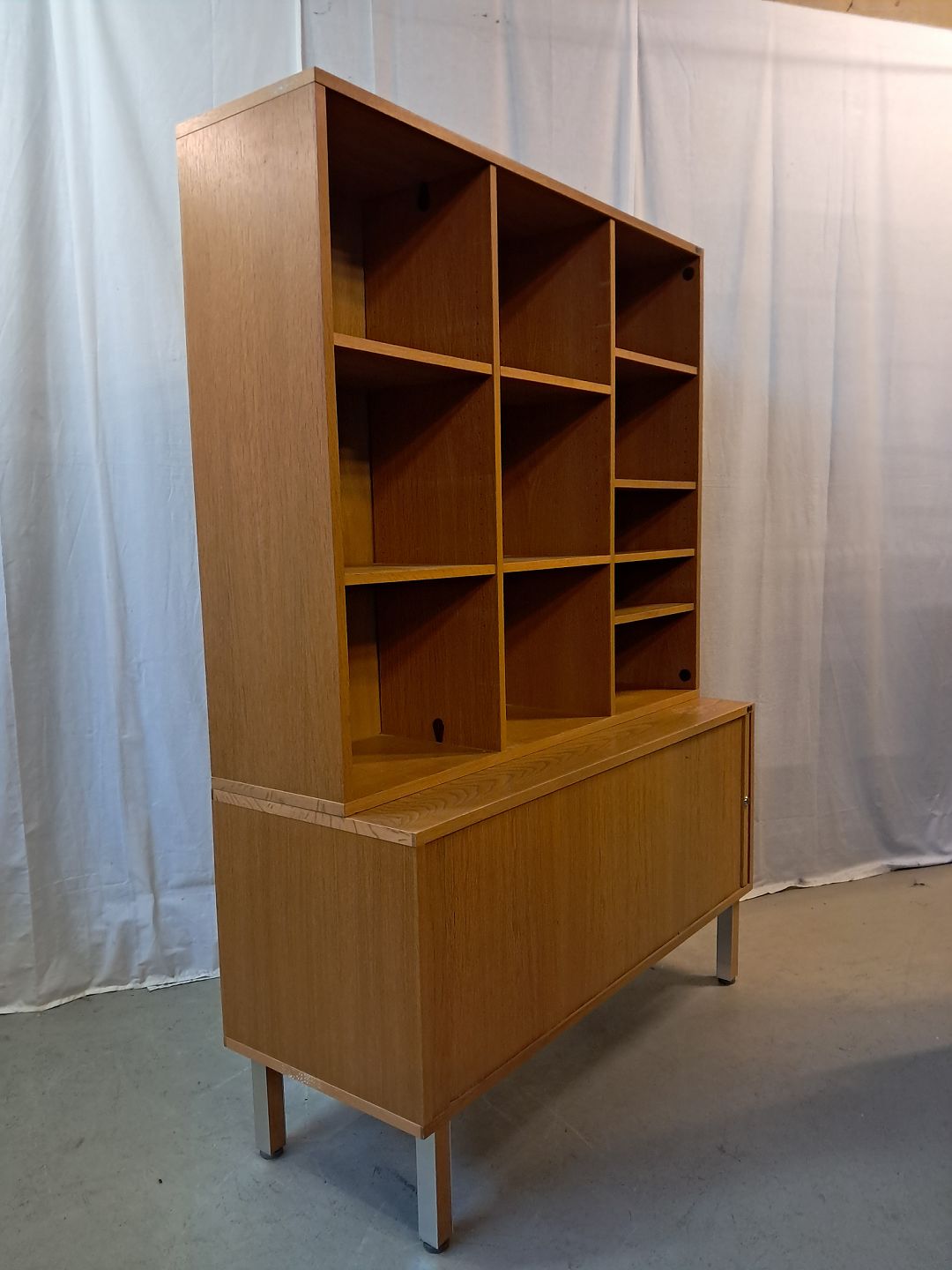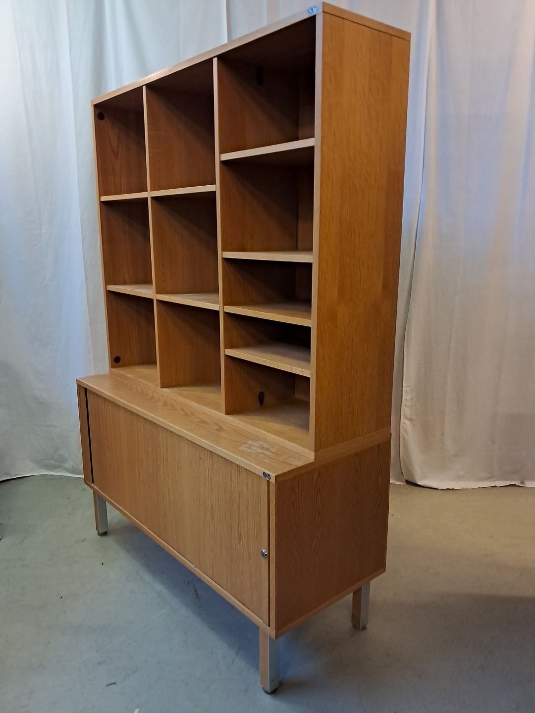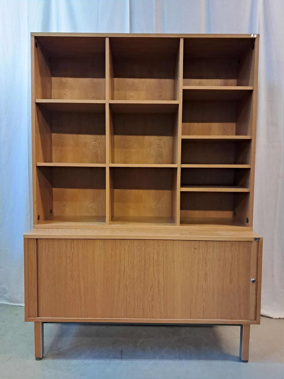 2 delt reolsektinon i fineret egetræ med jalousilåge, fra 1980erne.Den har brugsspor og der medfølger ikke nøgle.
