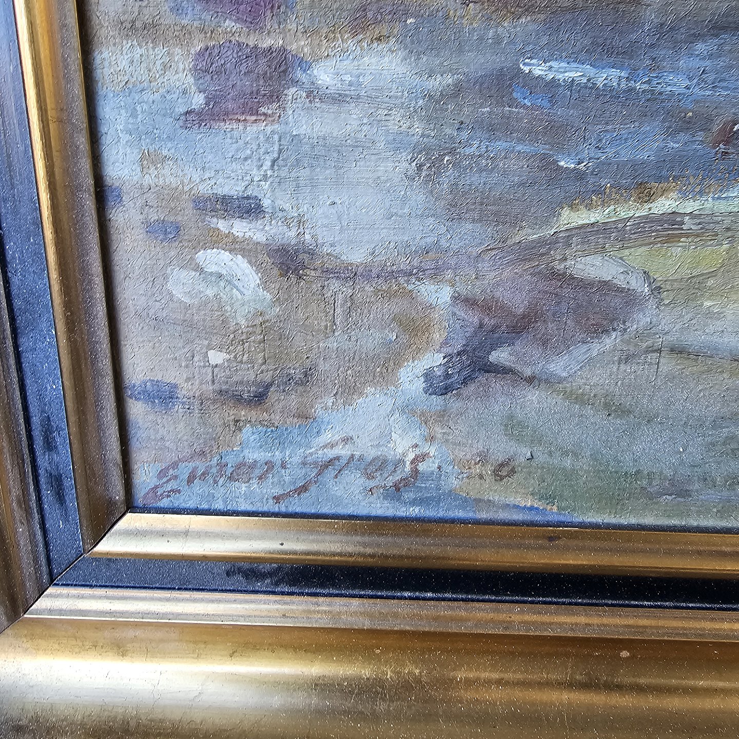 Oliemaleri på lærred monteret i guldramme med motiv af skibe på en strandKunstner Einer Gross (1895-1962)