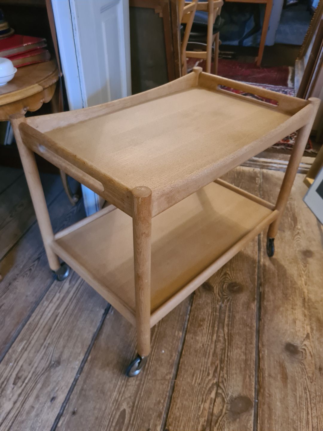 Rullebord i eg designet af Hans J. Wegner og fremstillet hos Andreas Tuck. Fremstår pænt og velholdt uden de store brugsspor.Højde 60 cm. Længde 72 cm. Bredde 47 cm.