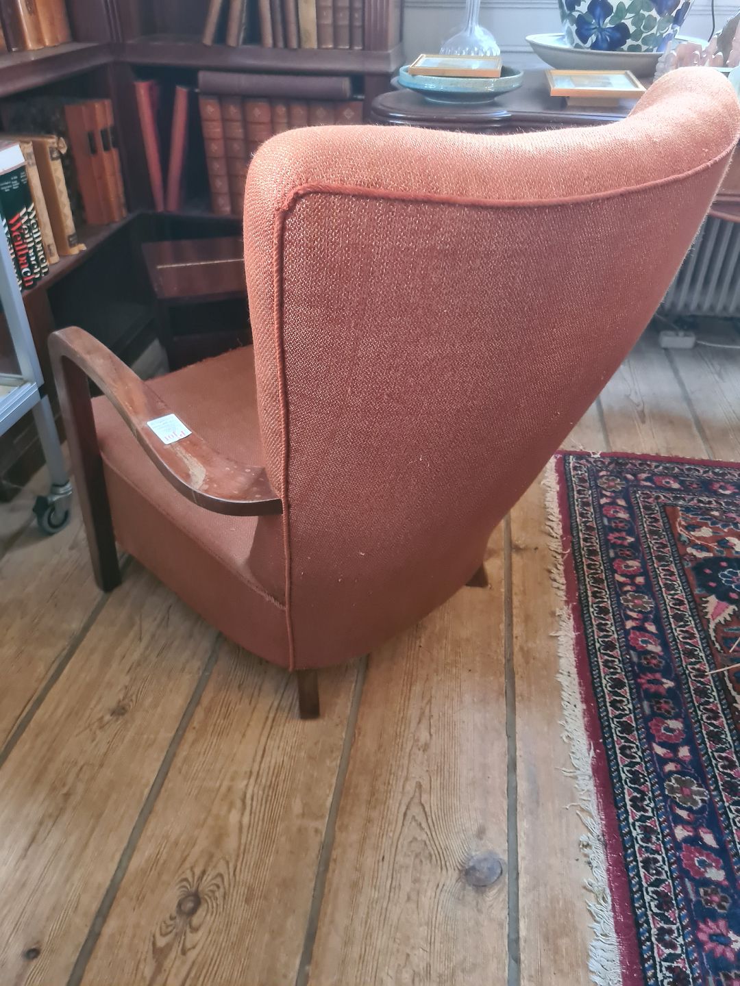Snedkermester lænestol fra 1960'erne i Cuba mahogni med stofbetrukket ryg og sæde. Fremstår god og stabil men med lettere brugsspor på især venstre armlæn og sæde. (Billede)Højde 89 cm. Bredde 70 cm. Dybde 89 cm.