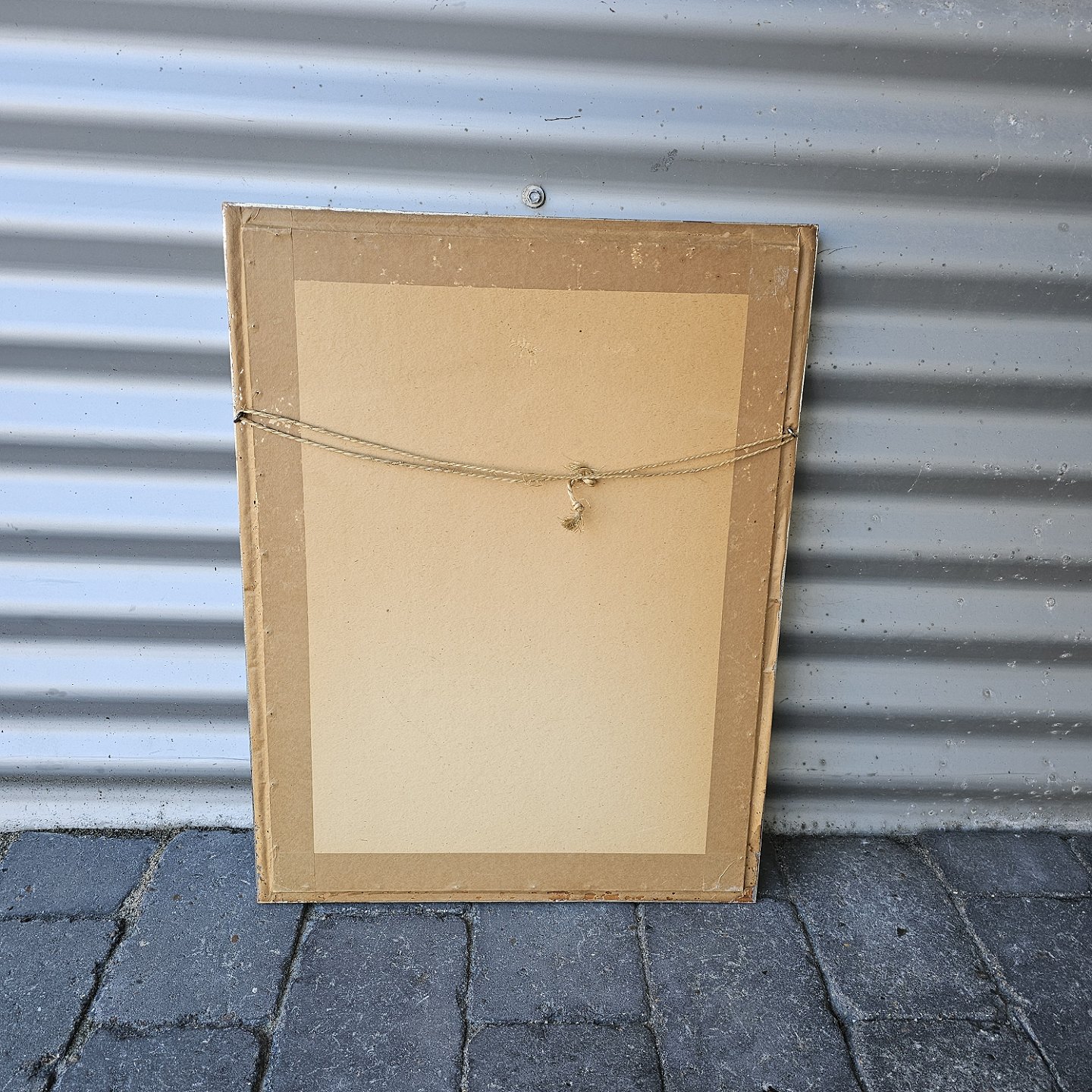Tryk på papir monteret i hvid ramme med abstrakt motiv af gule former på sort baggrundKunstner ukendt, signeret K. Aage 58