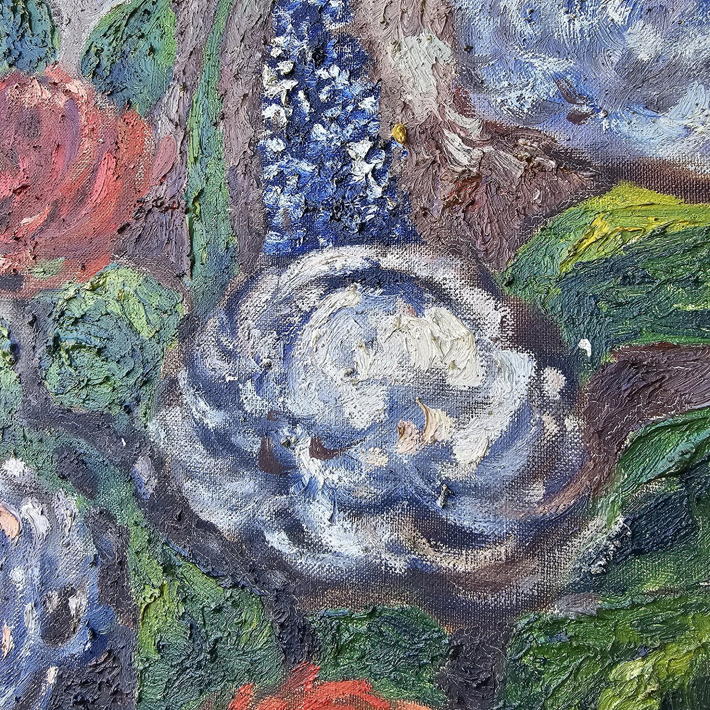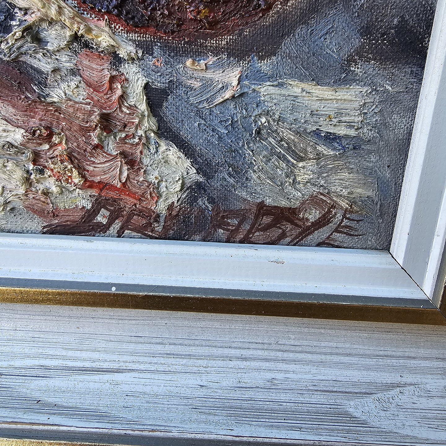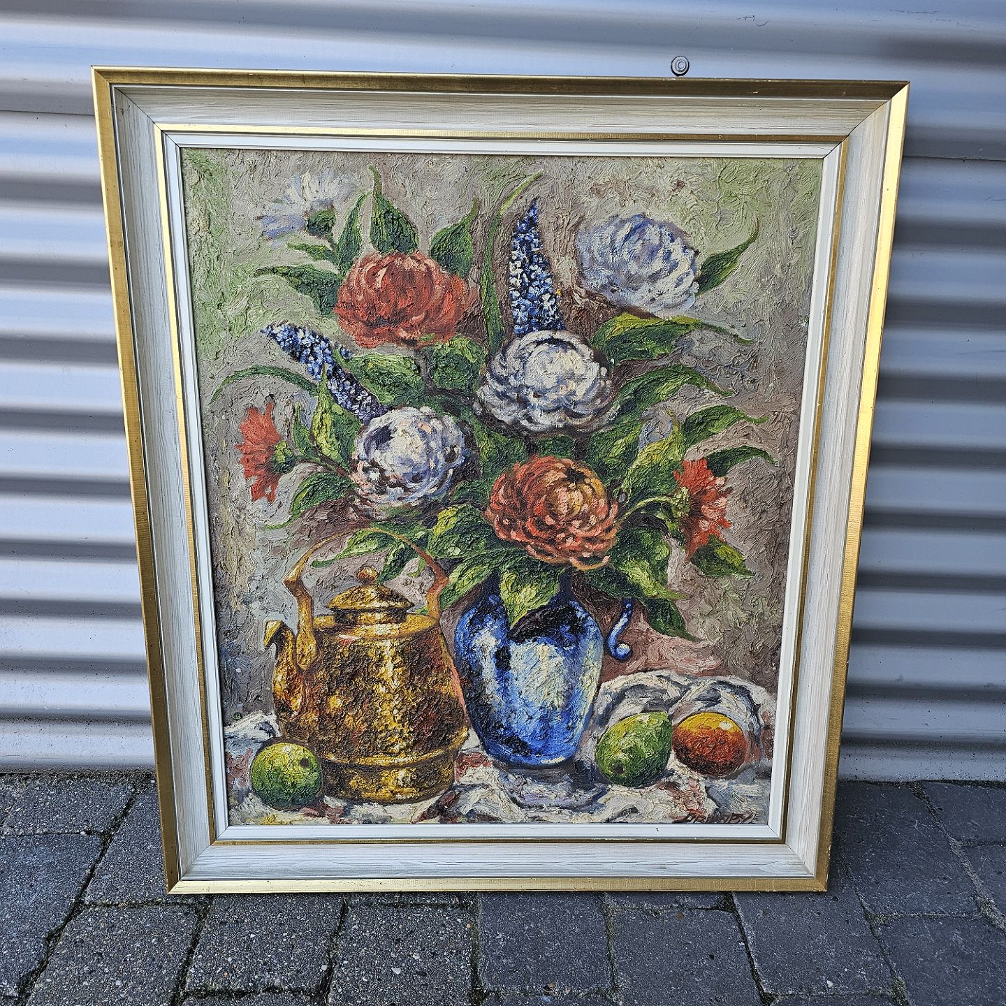 Oliemaleri på lærred monteret i hvid- og guldmalet ramme med motiv af en vase med blomsterKunstner Lars Draabye (1923-)