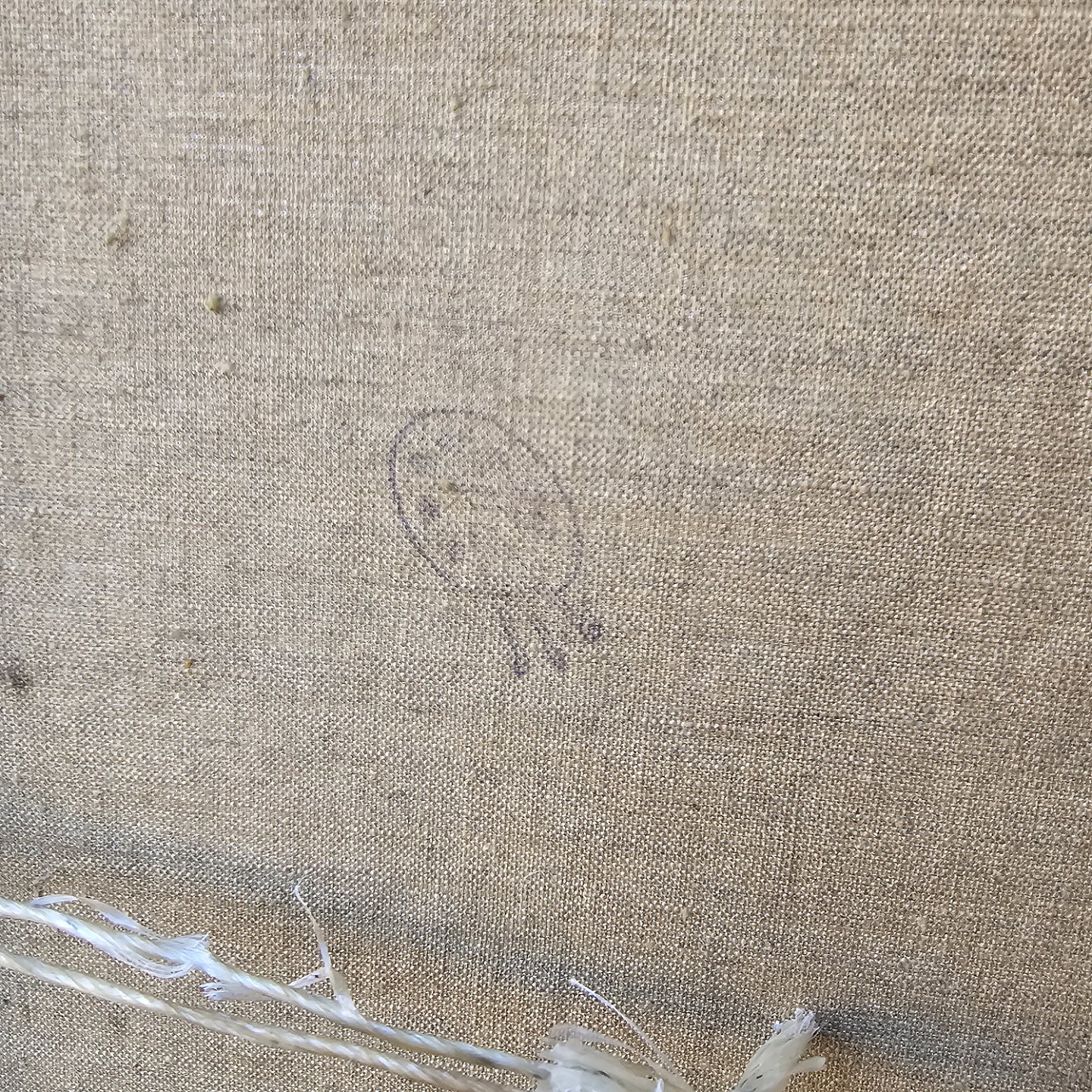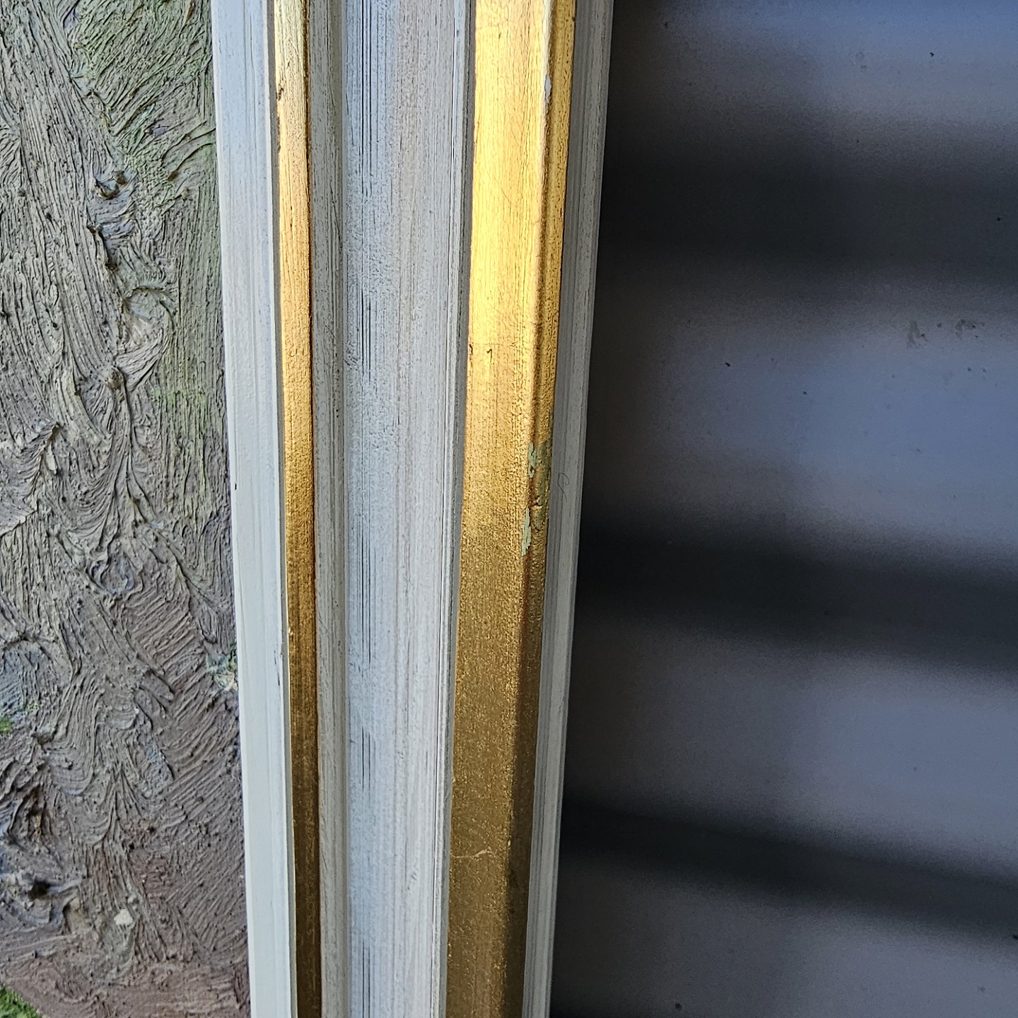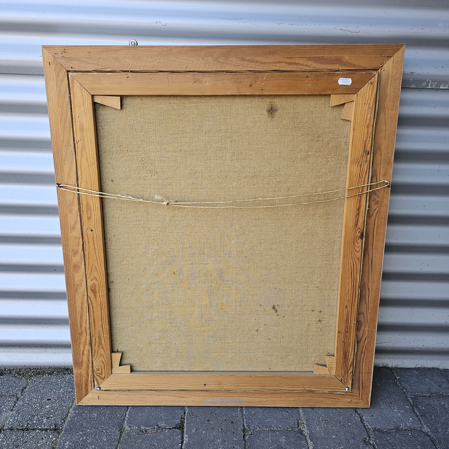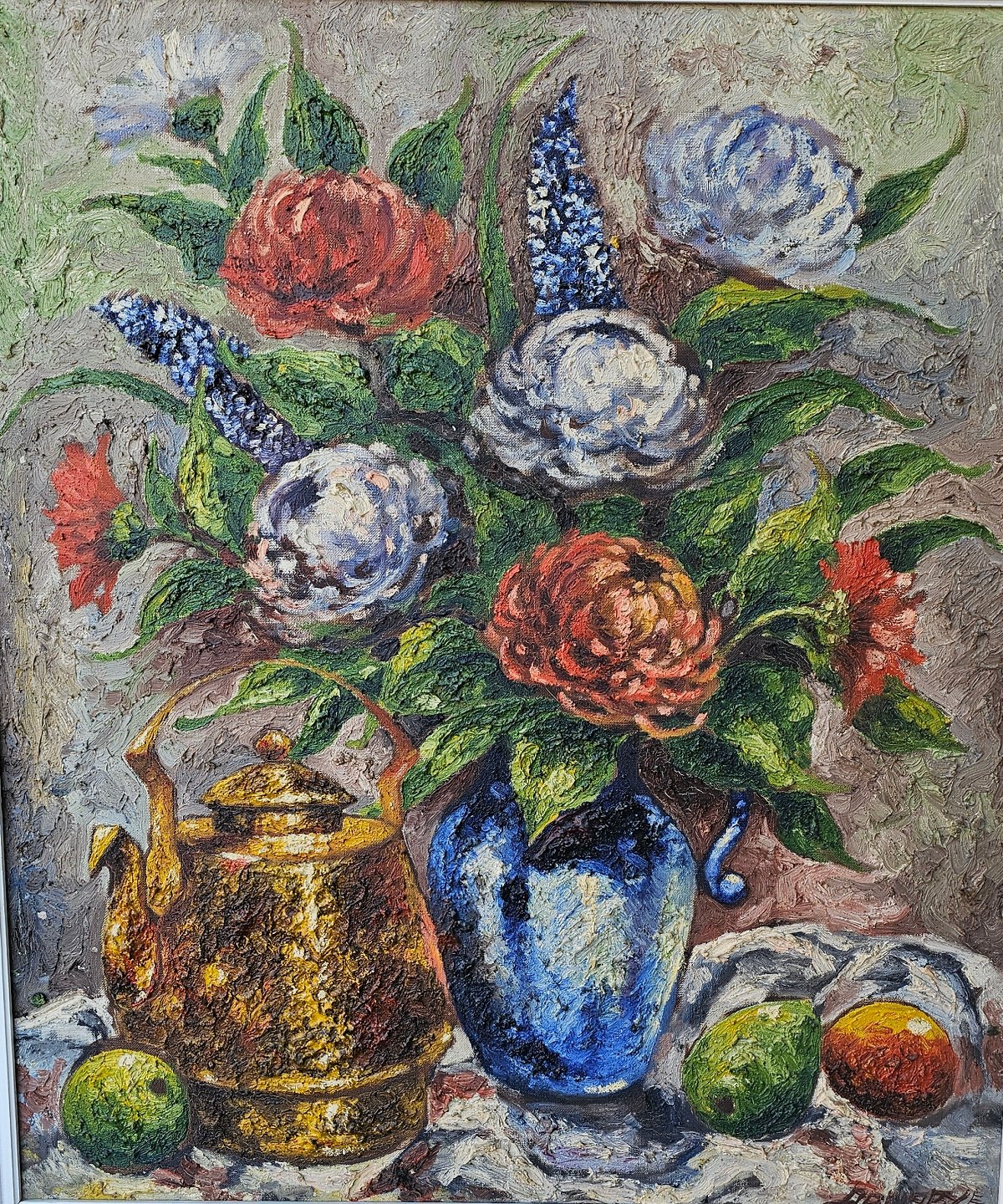 Oliemaleri på lærred monteret i hvid- og guldmalet ramme med motiv af en vase med blomsterKunstner Lars Draabye (1923-)