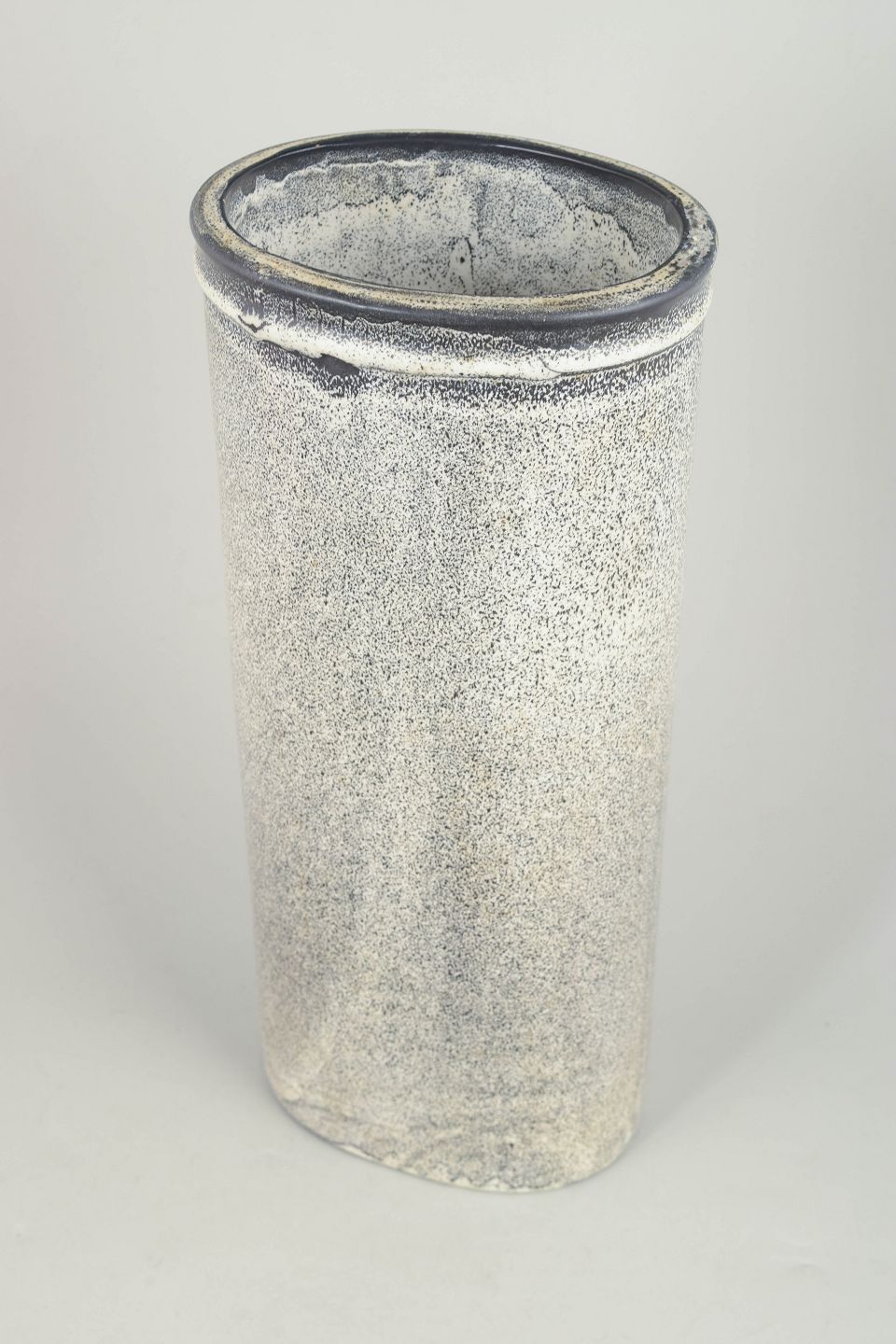 Svend Hammershøi for Kähler, stor vase.Stor vase i stentøj med cylindrisk form og karakteristisk dobbelt glasur i sorte og grå nuancer med levende, let krakeleret overflade. Et markant eksempel på Hammershøis monumentale formsprog og eksperimenterende glasurarbejde fra 1930’erne. Stemplet i bunden.