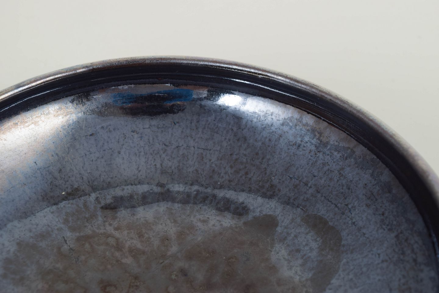 Svend Hammershøi for Kähler, skål.Dekorativ skål i stentøj med enkel, lav form og karakteristisk lustreglasur i mørke nuancer med fine spil i overfladen. Et klassisk eksempel på Hammershøis stilrene formsprog og sikre glasurarbejde fra 1930’erne. Stemplet i bunden.