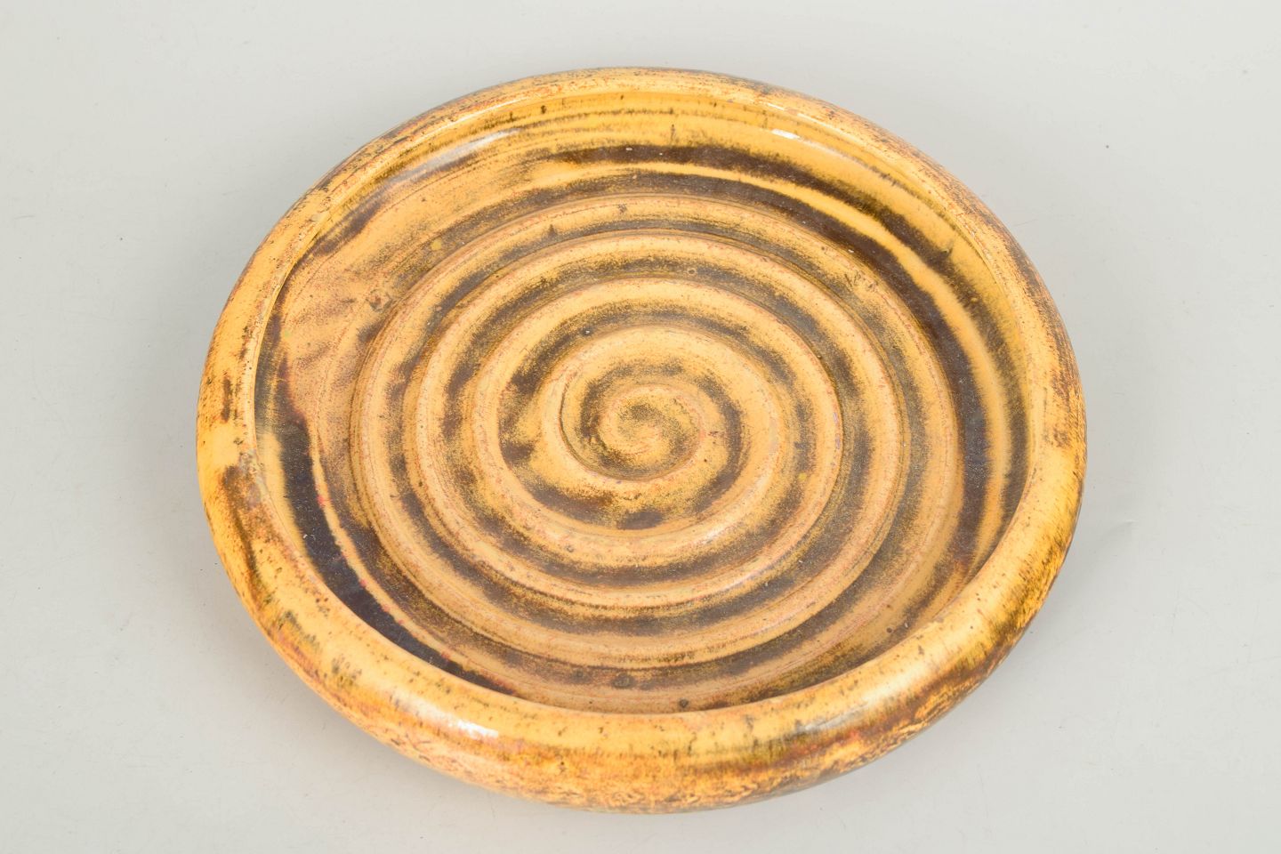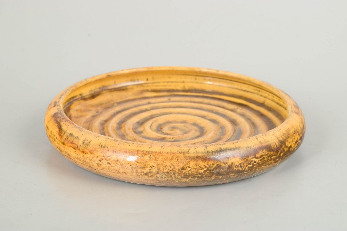 Svend Hammershøi for Kähler, fad.Dekorativt fad i stentøj med karakteristisk spiralornamentik og uranholdig glasur i gyldne og brunlige nuancer. Et markant eksempel på Hammershøis formsprog og eksperimenterende glasurarbejde fra 1930’erne. Stemplet i bunden.