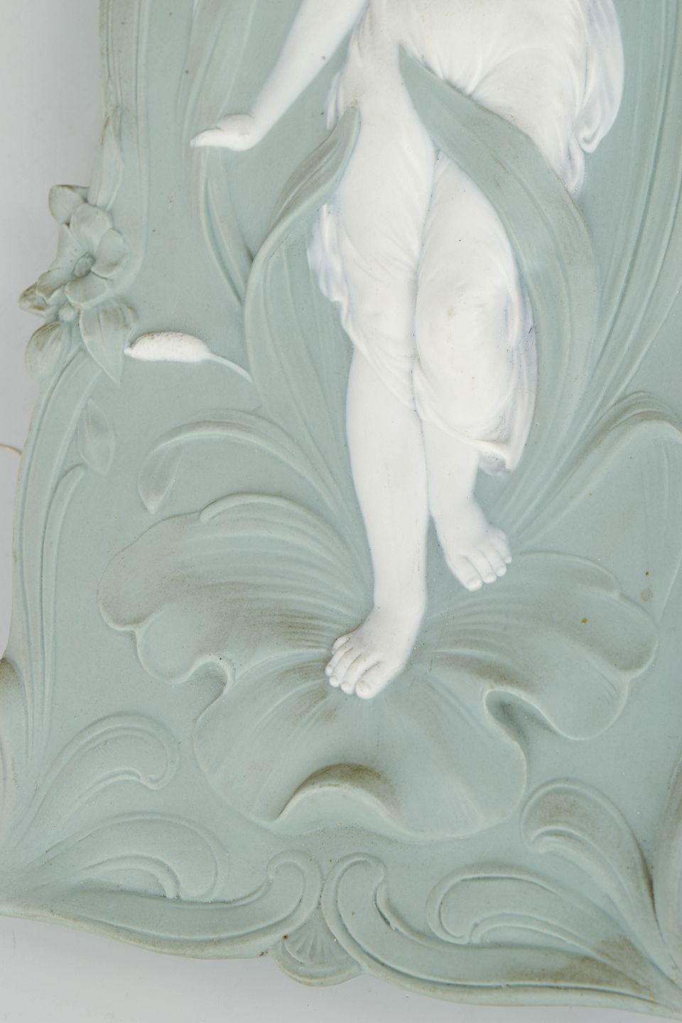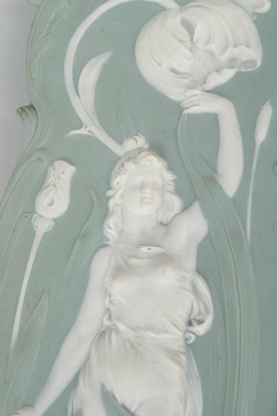 Triebner Ens & Co , vægrelief i biscuit og jasperware.Dekorativt art nouveau vægrelief i lysegrøn jasperware med hvid reliefdekoration forestillende en kvindefigur i bevægelse omgivet af organiske blomsterformer. Fremstillet i biscuitporcelæn med fin detaljering og klassisk jugendstil udtryk. Bagside med ophæng og fabriksmærke.