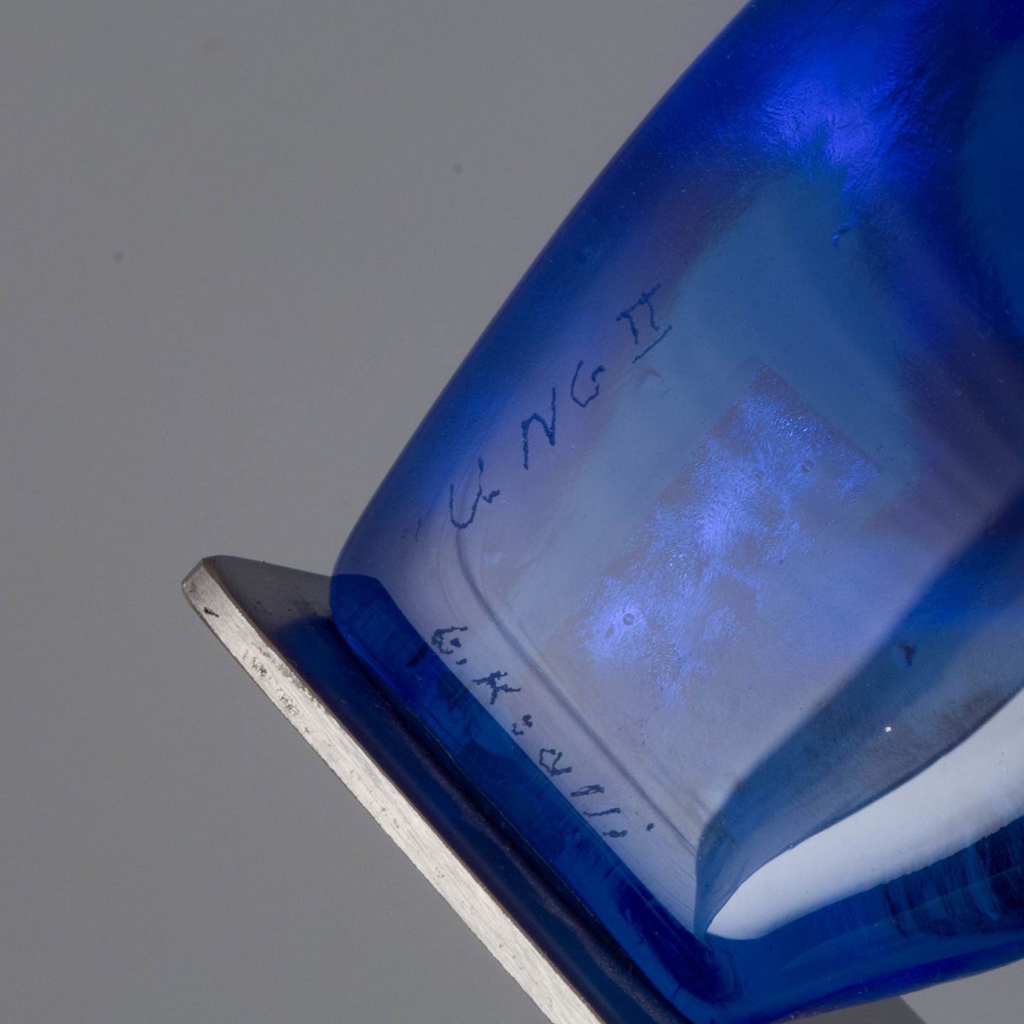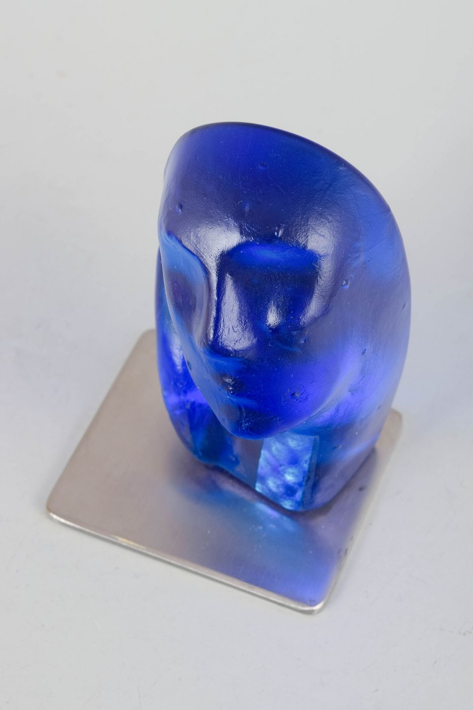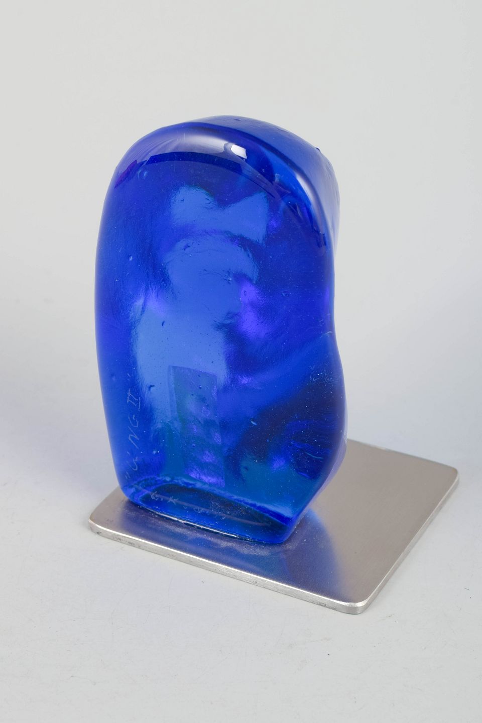 Georgianna Kralli, unik studioglas skulptur "Ung II".Organisk formet skulptur i mundblæst glas med dyb blå farve og indkapslede figurative elementer. Signeret af kunstneren og udført i eget værksted.