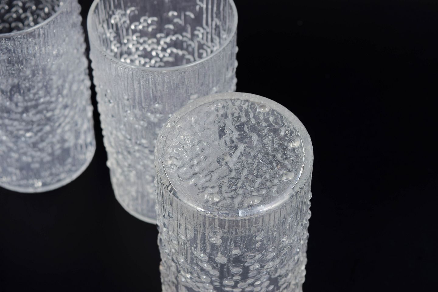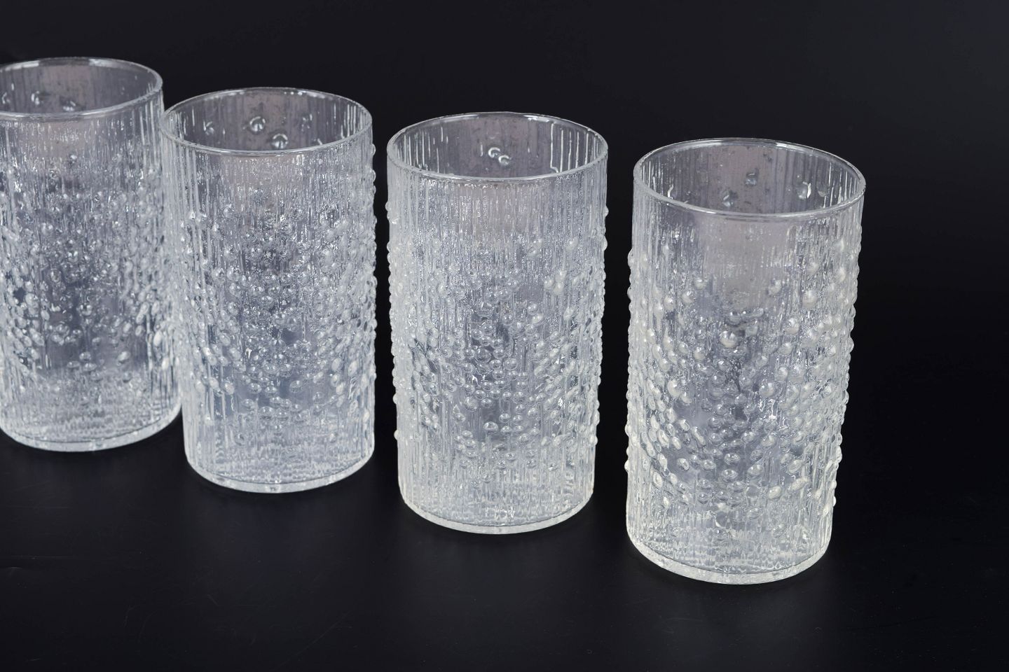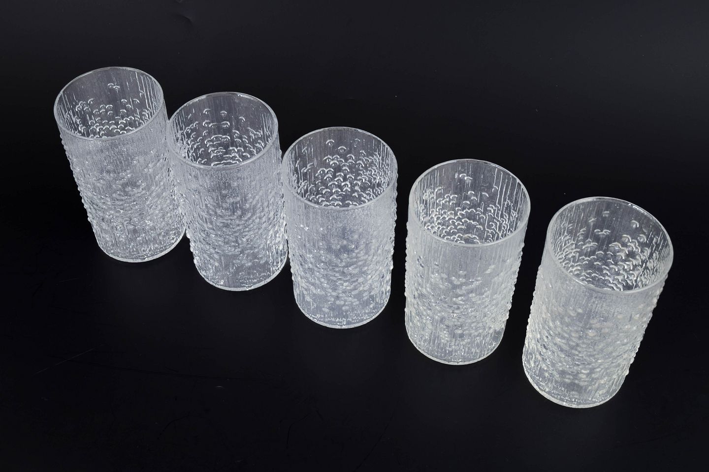 Tapio Wirkkala for Iittala, sæt af fem drikkeglas "Hopla" serien.Sæt af fem drikkeglas i presset glas med karakteristisk organisk struktur og reliefmønster, der skaber et levende lysspil i overfladen. Designet er et klassisk eksempel på finsk glasdesign fra perioden. Model Hopla i klart glas.