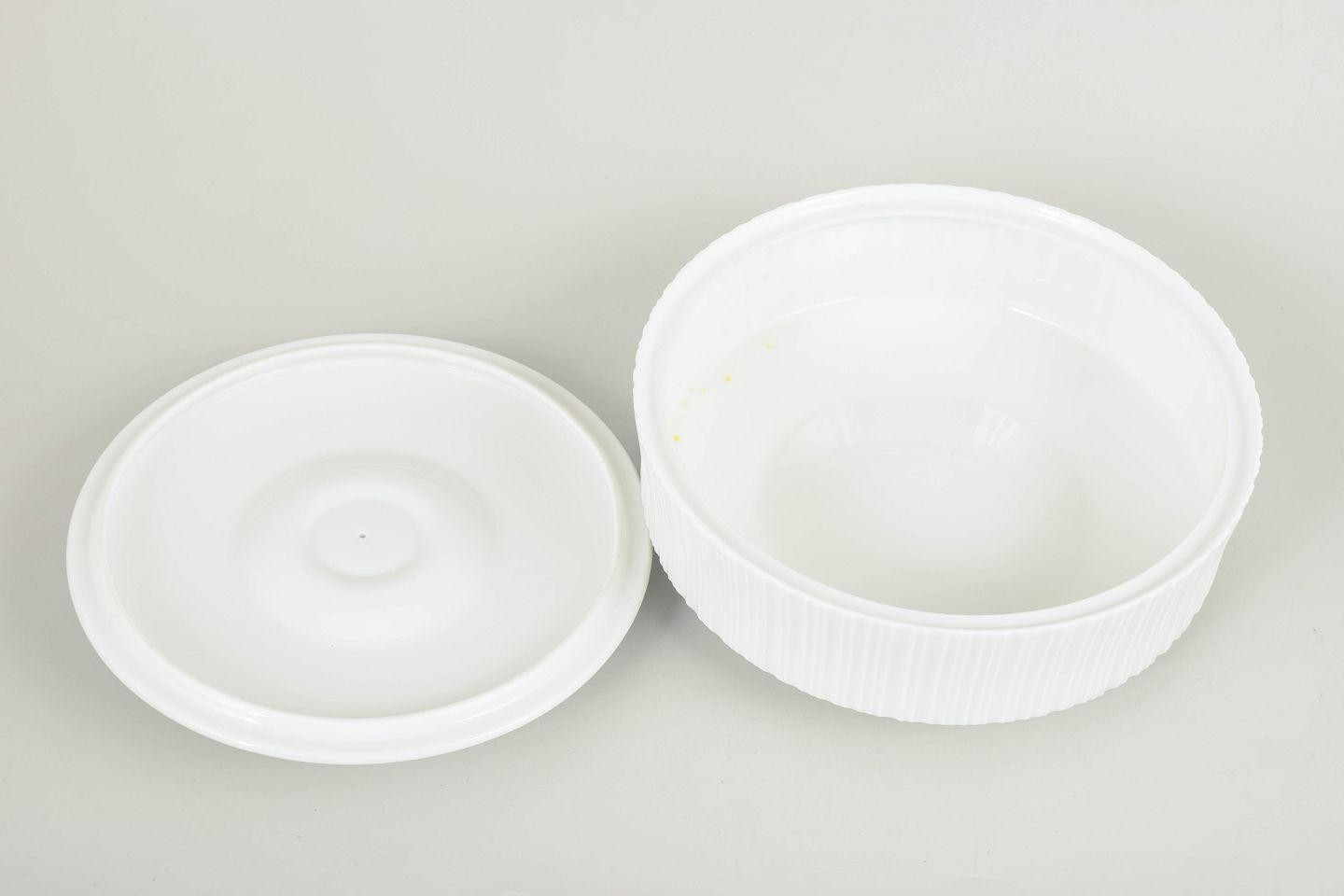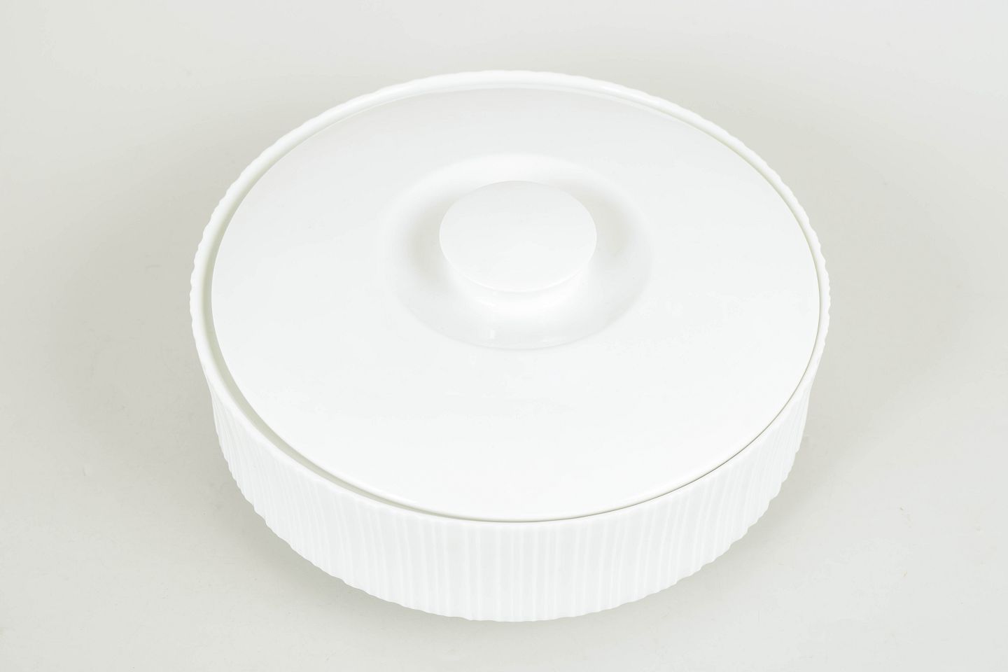 Tapio Wirkkala for Rosenthal, skål med låg.Rund skål med låg i porcelæn med lodrette rifler og et stramt, funktionalistisk formsprog, typisk for Tapio Wirkkalas arbejde for Rosenthal i 1980’erne.
