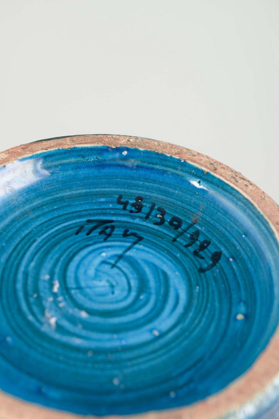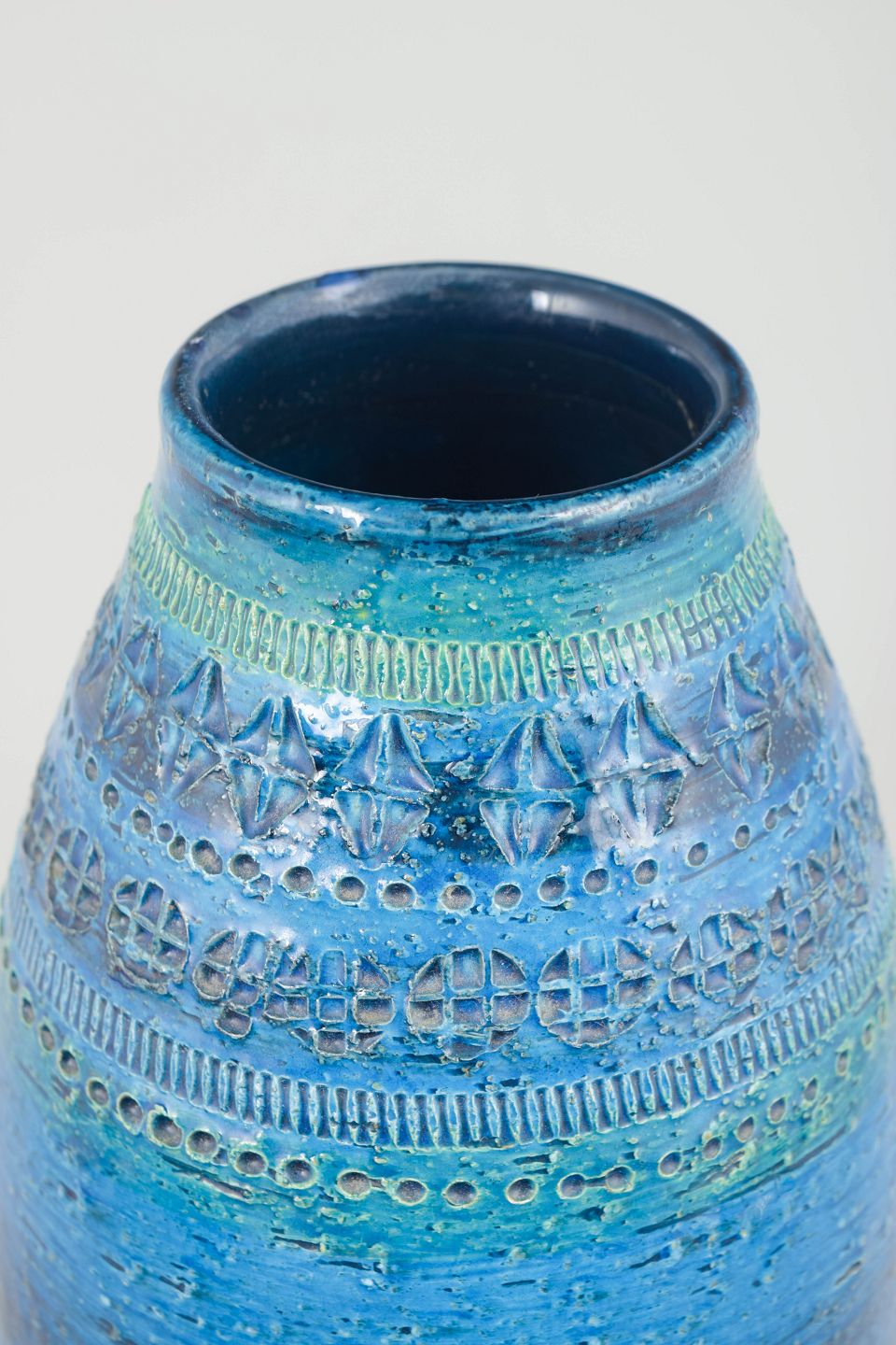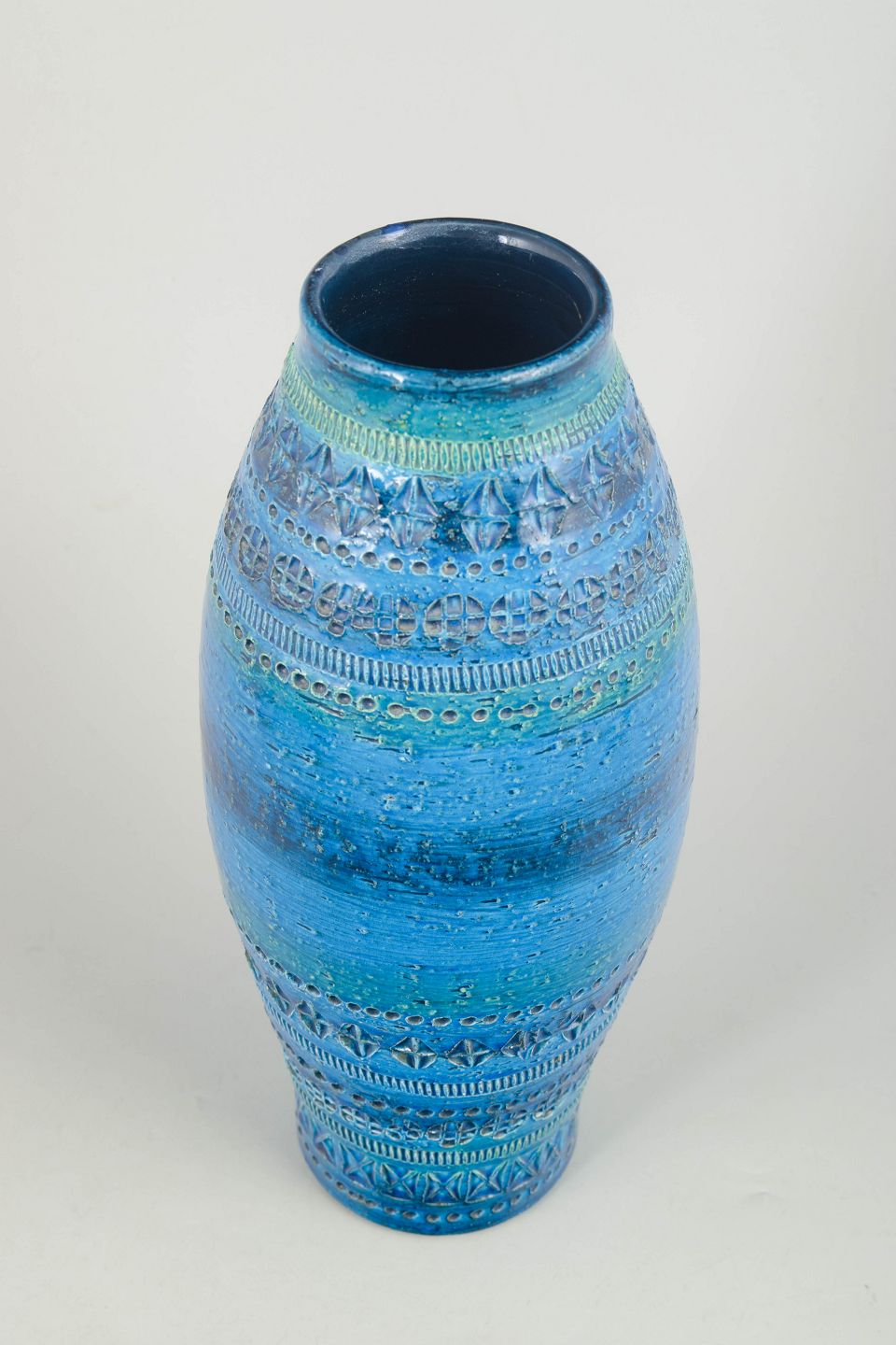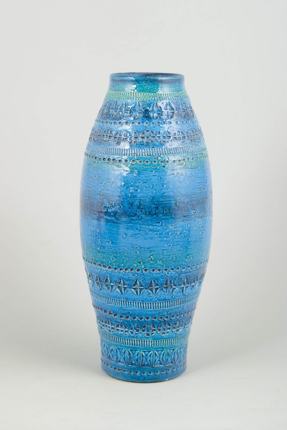 Aldo Londi for Bitossi, stor vase.Stor dekorativ stentøjsvase med cylindrisk form og let tilspidset hals, udført med karakteristisk riflet struktur og glasur i nuancer af blå og turkis med subtile variationer.