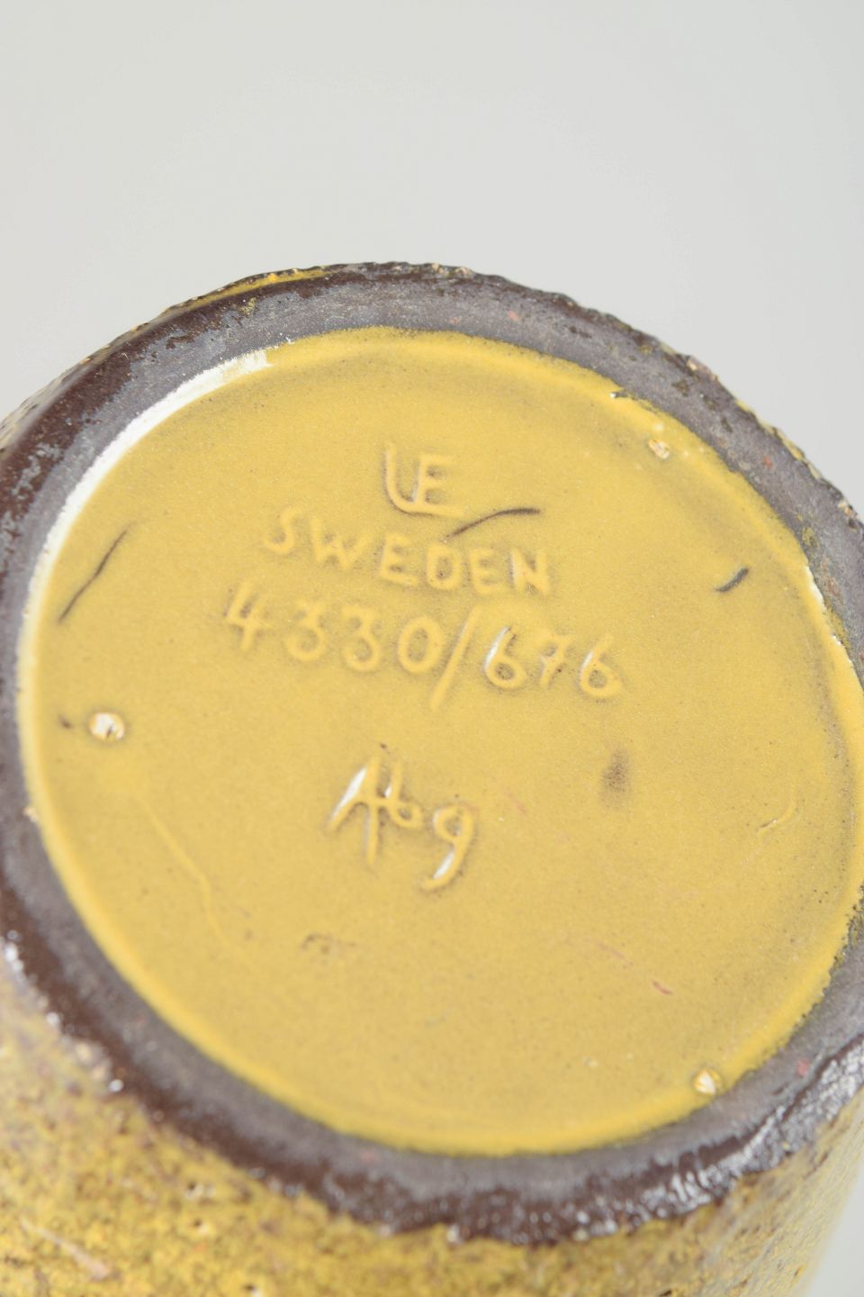 Ingrid Atterberg for Upsala Ekeby, vase.Elegant, høj vase i stentøj med slank form og karakteristisk tofarvet glasur i gul og brunviolette nuancer. Modellen 4330/676 fra 1960’erne fremstår med en raffineret overflade og klassisk skandinavisk formsprog.