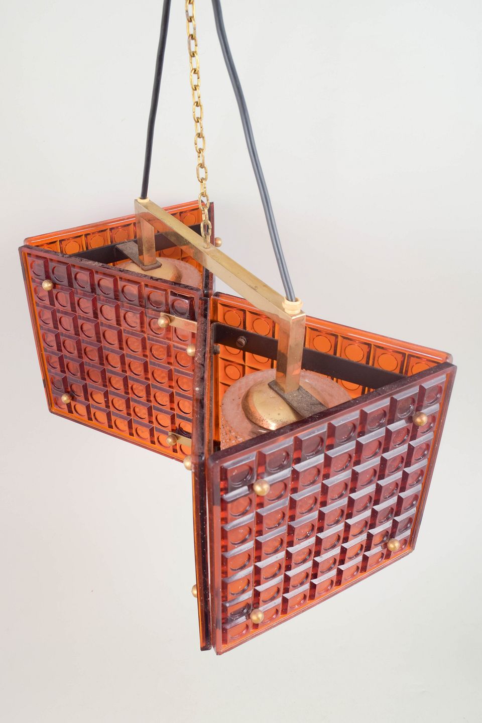 Mac Hegerup for Kronoberg, pendel lampe i ravfarvet glas og messing.Dekorativ loftlampe med geometrisk form opbygget af glasfelter i varm ravtone indfattet i messingstruktur. Ophæng i metaltråd, giver et elegant og let udtryk med smukt lysgennemfald.
