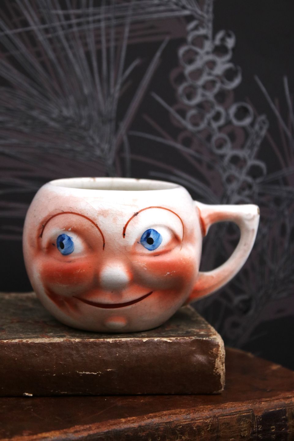 Gamle fajance kopper med hank og sjove ansigter fra omkring år 1930.Måler: H: 6,5cm. Dia.: 8,5-9cm.