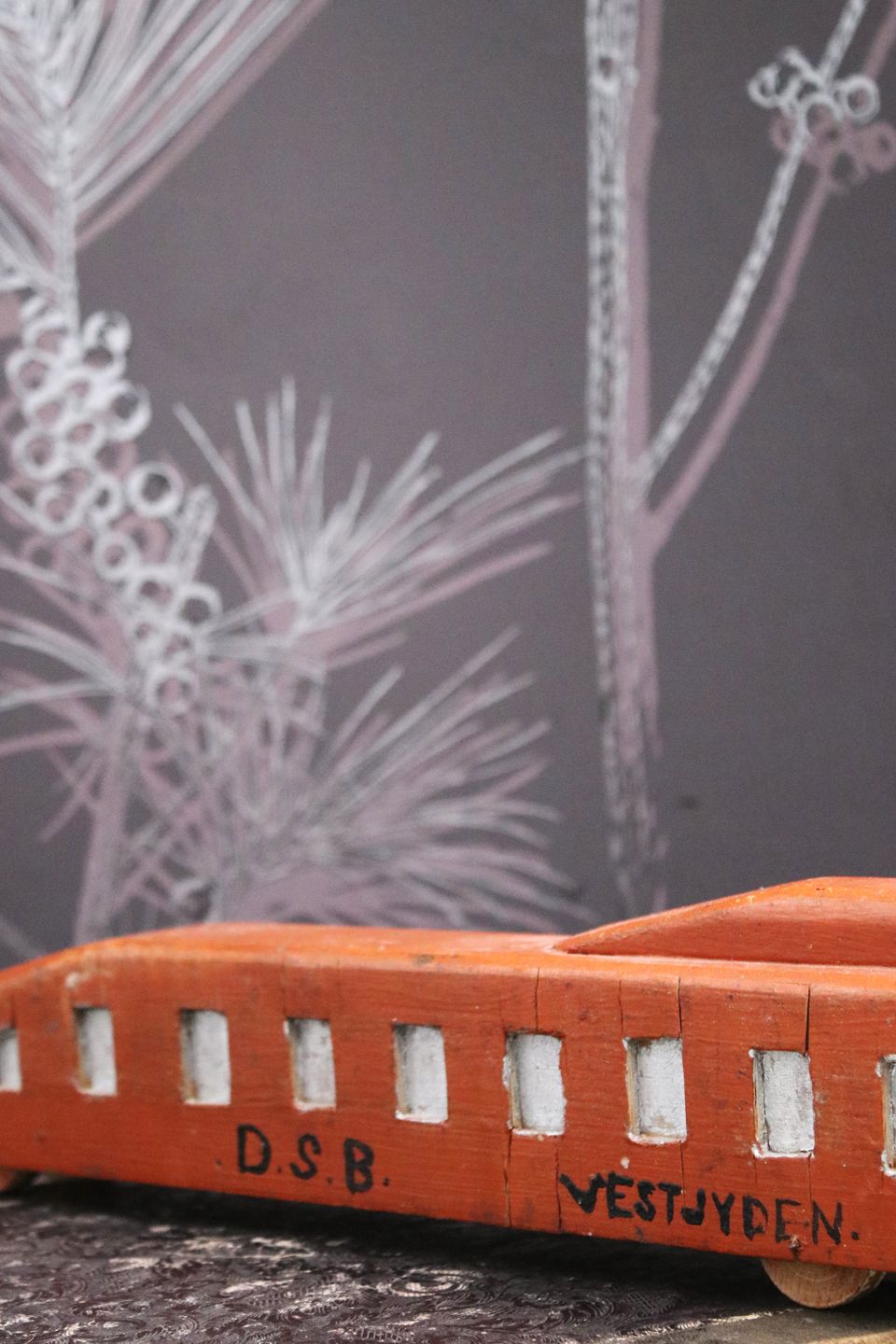 Dekorativ, gammel vintage tog "DSB - Vestjyden" i træ bemalet i rødbrun farve med en fin gammel patina.