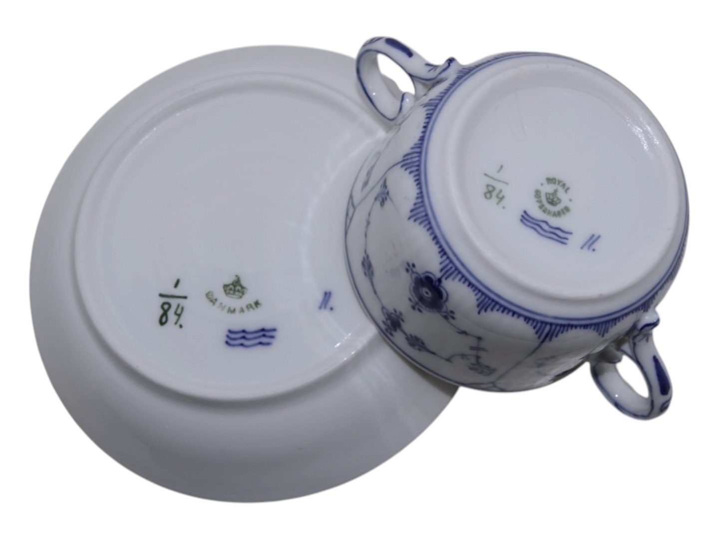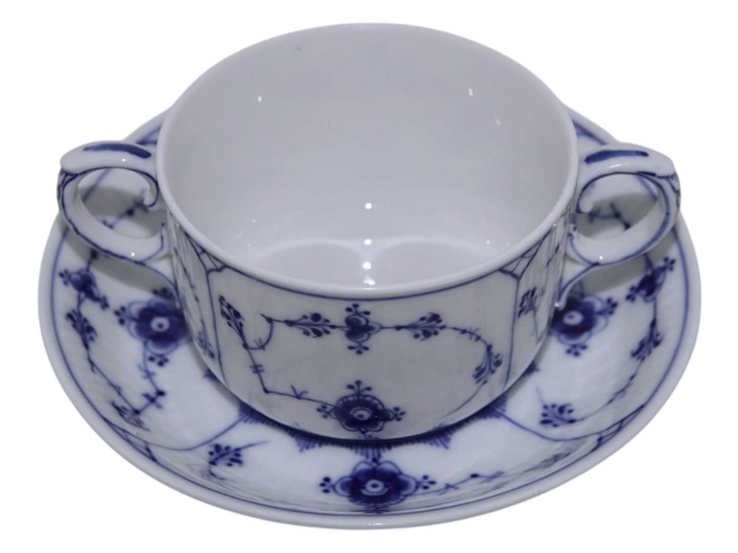 Royal Copenhagen Musselmalet Riflet, lille bouillionkop / ragoutkop uden låg men med tilhørende underkop.