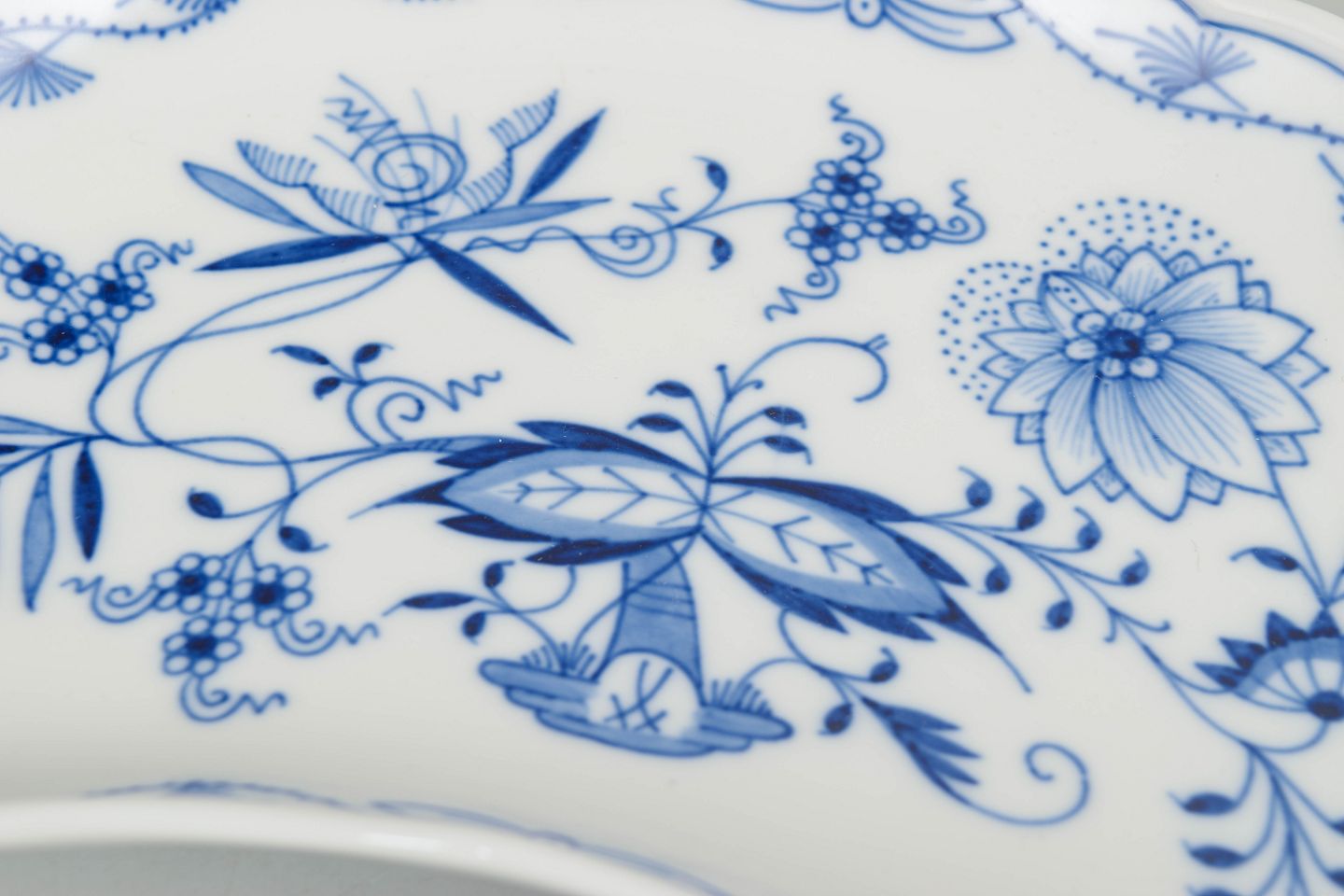 Meissen løgmønster, fad.Dekorativt fad i porcelæn med håndmalet blå dekoration i det klassiske løgmønster. Fremstillet hos Meissen i begyndelsen af 1900-tallet og markeret med Meissen krydssværd.