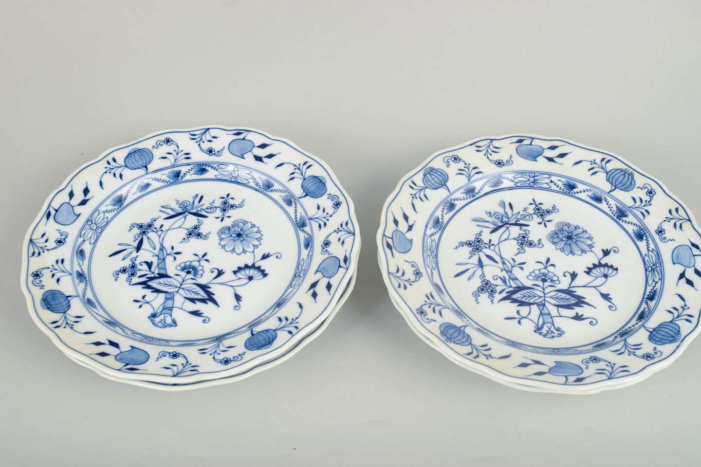 Meissen løgmønster, sæt af fire middagstallerkener.Fire klassiske middagstallerkener i porcelæn med håndmalet blå dekoration i det traditionelle løgmønster. Fremstillet hos Meissen i begyndelsen af 1900-tallet i første sortering og markeret med Meissen krydssværd.